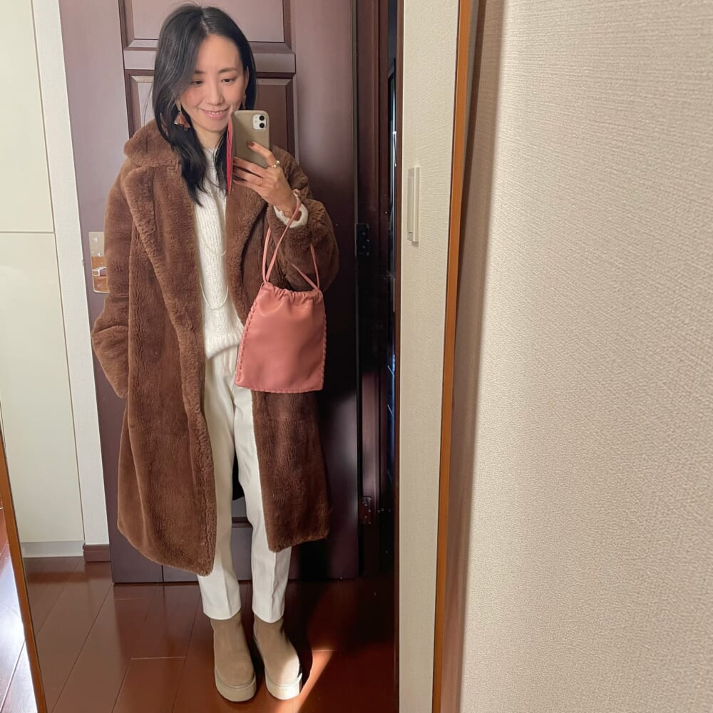 ボアコートが主役のブラウン×ホワイトコーデ