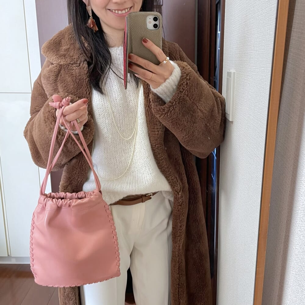 キャメル×ピンクのピアスをヒントに、バッグはピンクをON