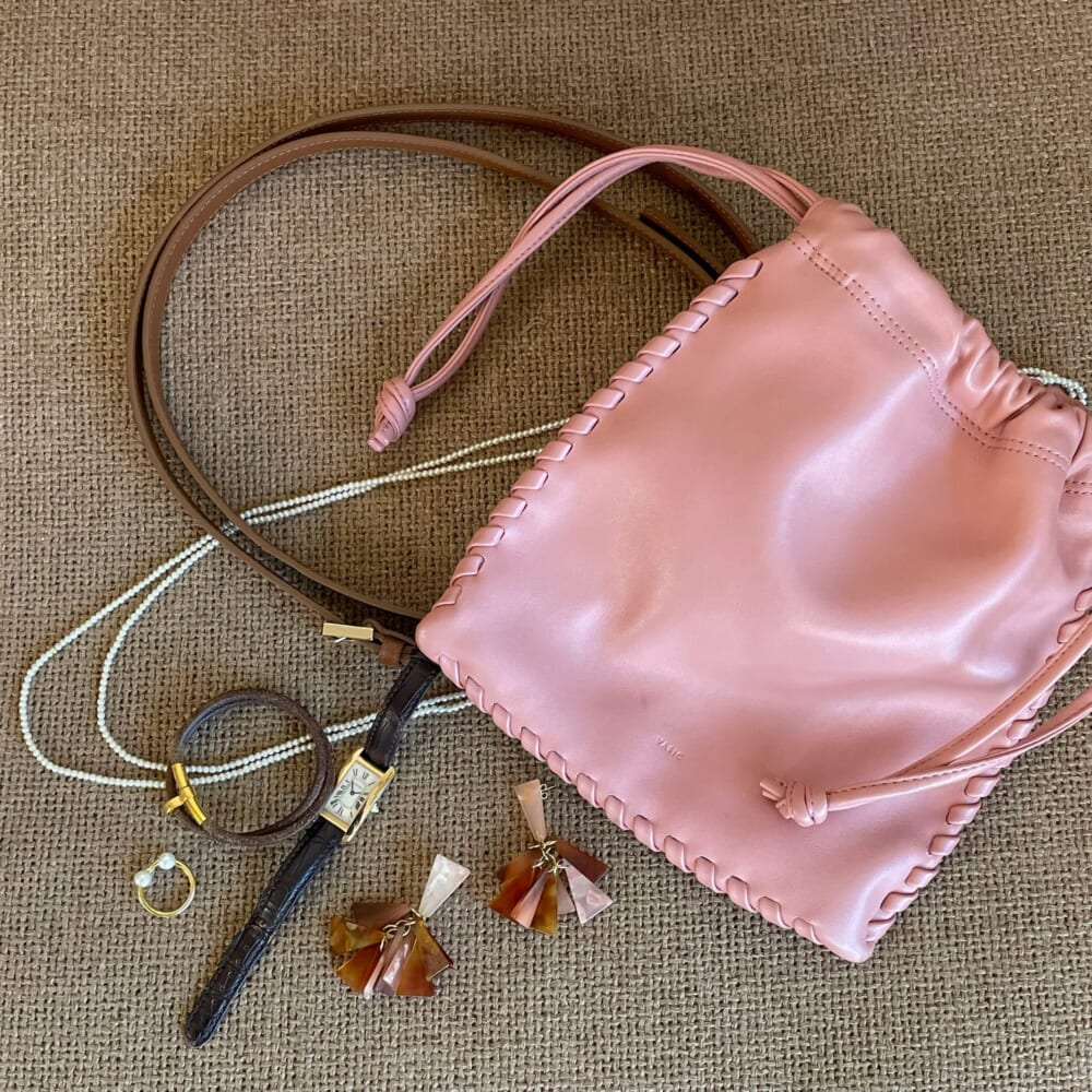 バッグはアクセントカラーとしてピンクを。