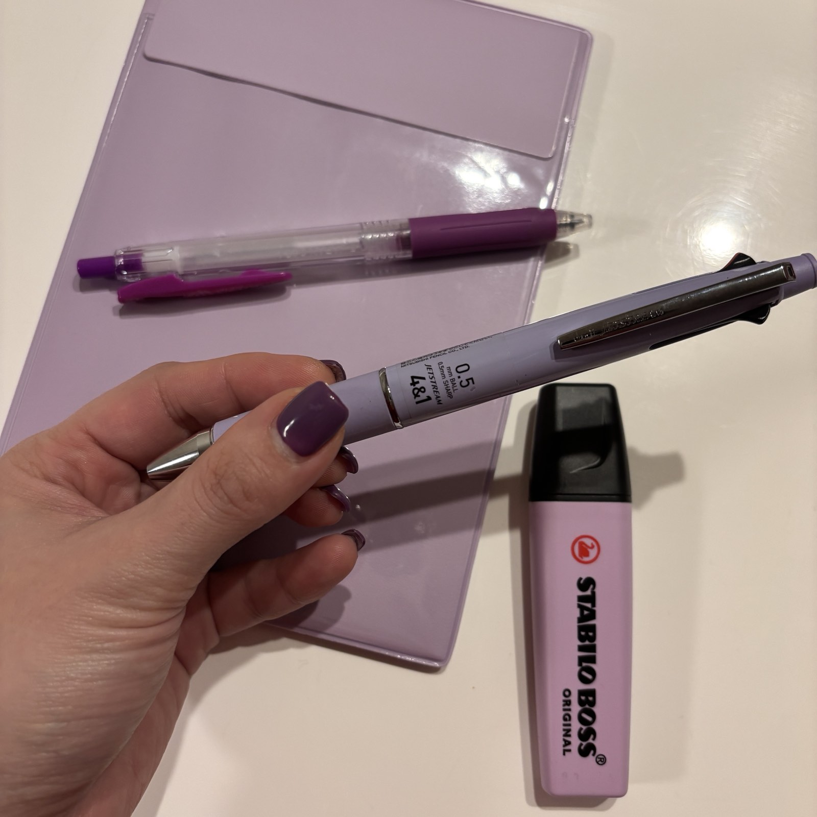 最初はJET STREAM 4色ボールペンのラベンダーカラーに。一瞬でなんかイイとなりました。「気分よく、来年久しぶりにいつものボールペン変えよかな」と思う12月のタイミングで購入。今まであまり意識しなかった色、紫になぜかなぜか反応した12月始め。そこからは反応、反応、反応!