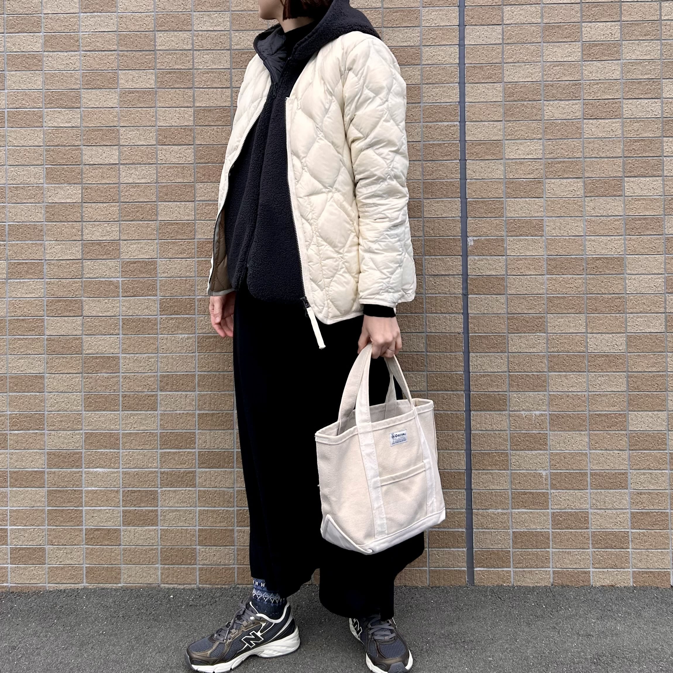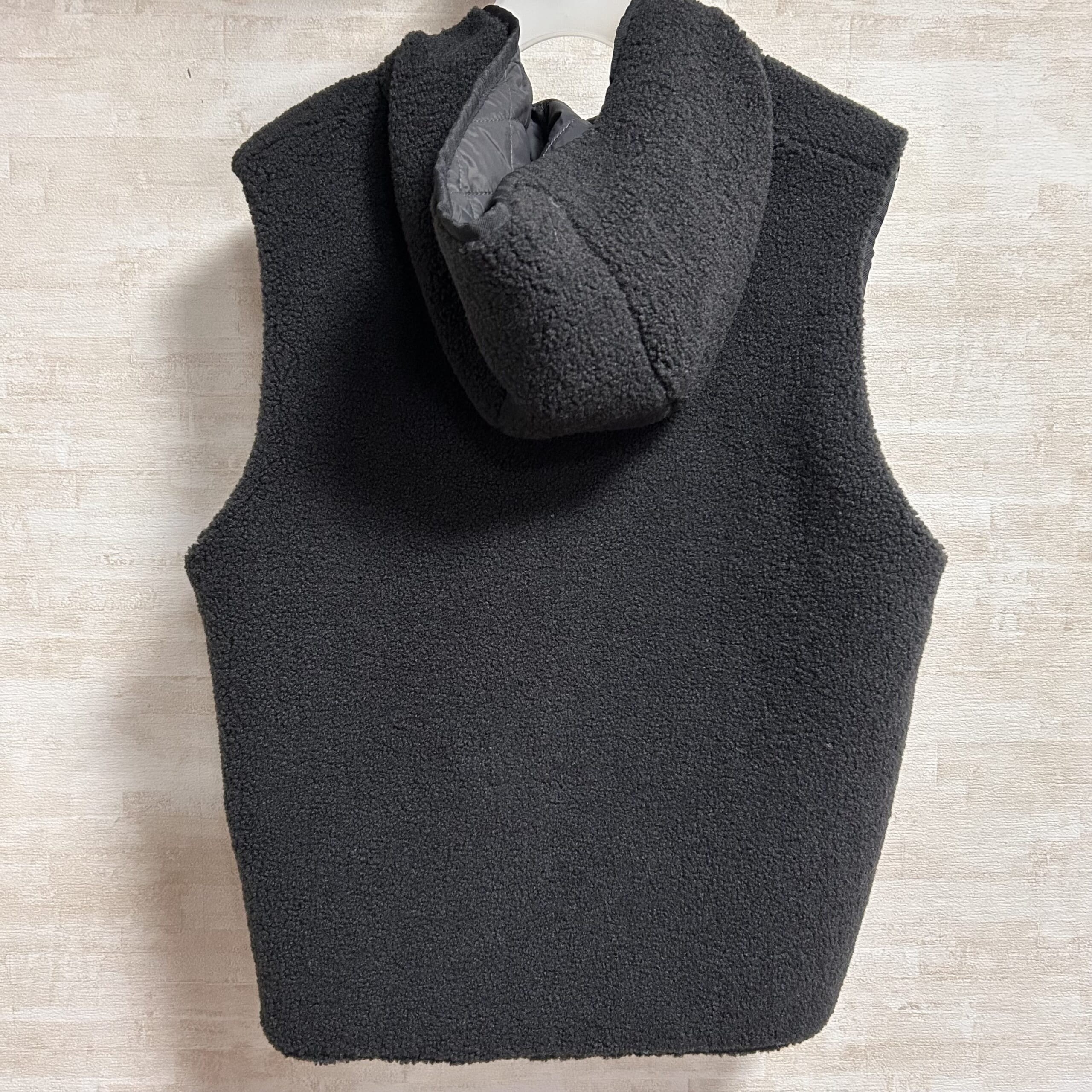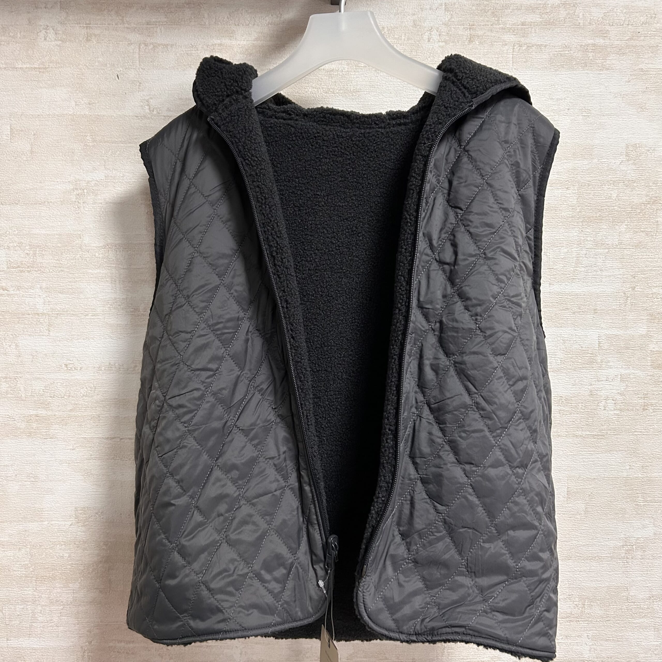 フリーサイズ、色は3色展開(スモーク、アイボリー、モカ)です。わたしはスモークを購入しました。定価の10%オフで購入!4,950円でした☺️や、安い…。この日はコジコジとのコラボグッズを見たいなぁ(あわよくば買いたいなぁ)とお店を覗いたら、コジコジではなくボアベストと目が合いまして…。ほっこり顔の私は、ボアを着るとますますほっこり感が増して、部屋着?ってなりそうだった(ていうか、なる)ので今まで避けてたのですが、リバーシブルでキルト面がちらっと見えるので、部屋着感を回避!できるような気がします。