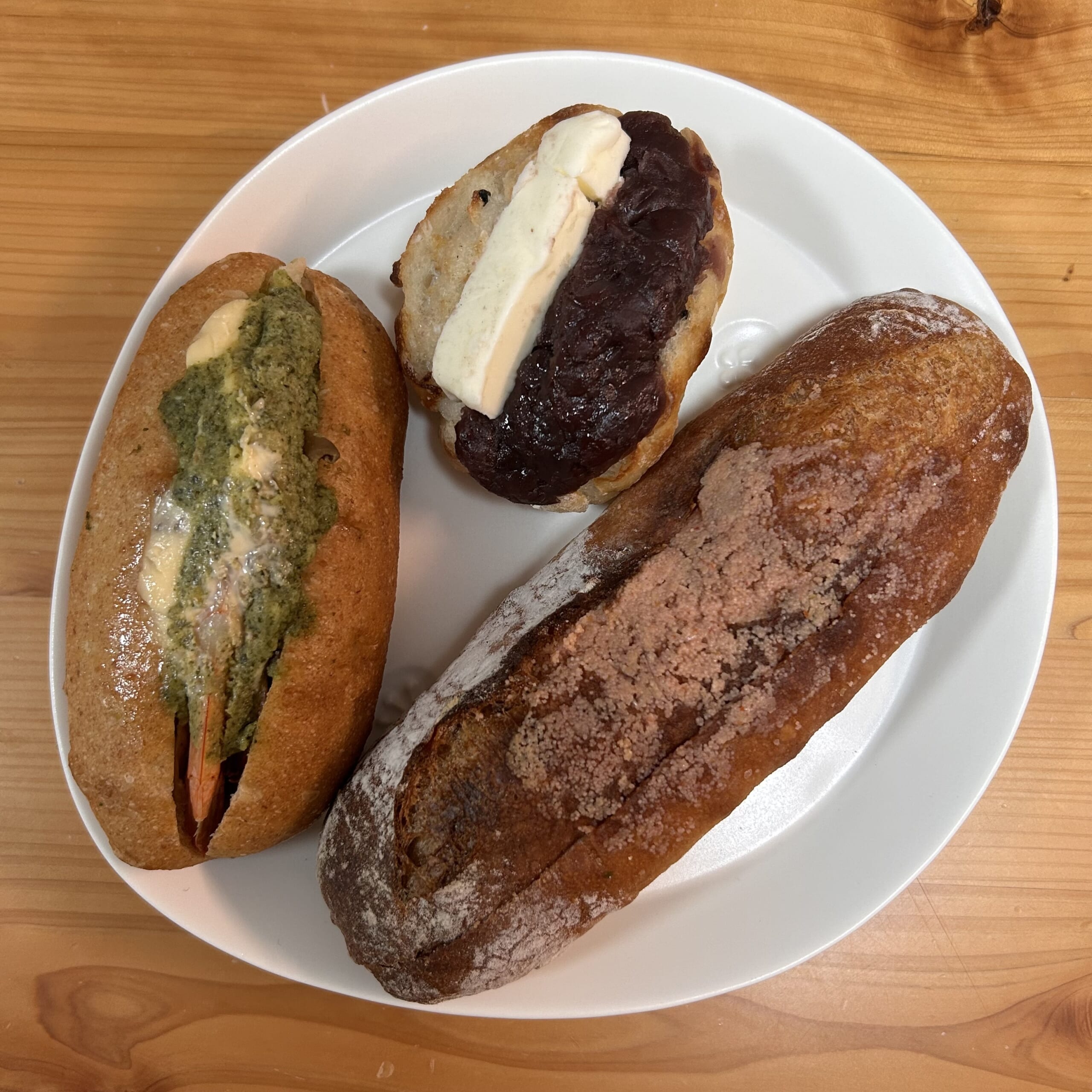 ガーリックシュリンプの断面美。プリッとしたエビ、その下にきのこ、バジルがしっかり絡んで美味しい…🤤カルピスバターのあんフランスは、餡がふわふわ!こんな厚切りのバターいいんですか?と思いながら頬張ると、意外にもあっさりしたお味、だけど食べ応えしっかりでした。あんバターって、罪な味ですよね…。