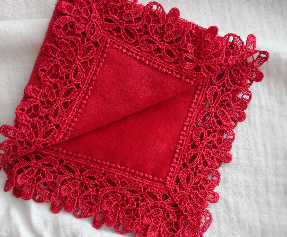 わたしには年始にギフトでいただいた近沢レース店の赤いファビュラスなハンドタオルがついている!