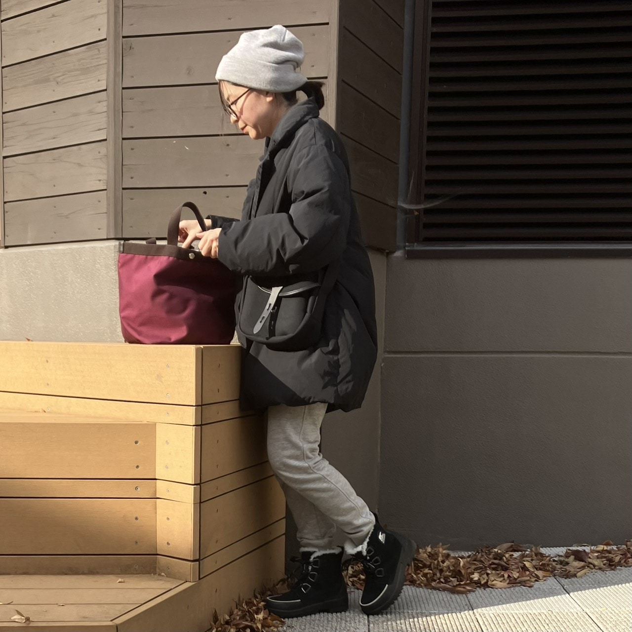 どんな色にも不思議と馴染む色で、黒や白など服の色を選ばないバッグと同じような感覚で選べるのが魅力。カーキのカーゴパンツやデニム×白Tファッション、オールホワイトファッションに合わせても可愛いです。暖かい季節もよく使っています。