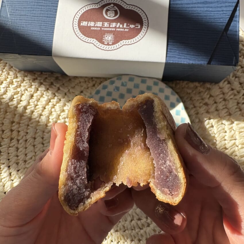 「道後湯玉まんじゅう」は、温泉街の雰囲気を感じながら誰かと一緒に食べて、もちもち食感のおいしさを共有したくなる味わい。