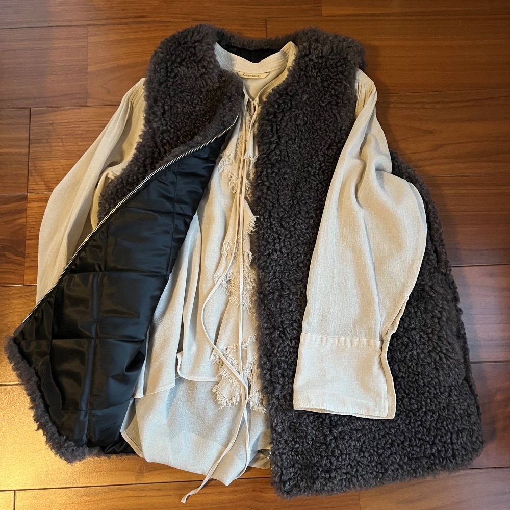 着用したのは、カレンソロジーのリバーキルトファーベスト。