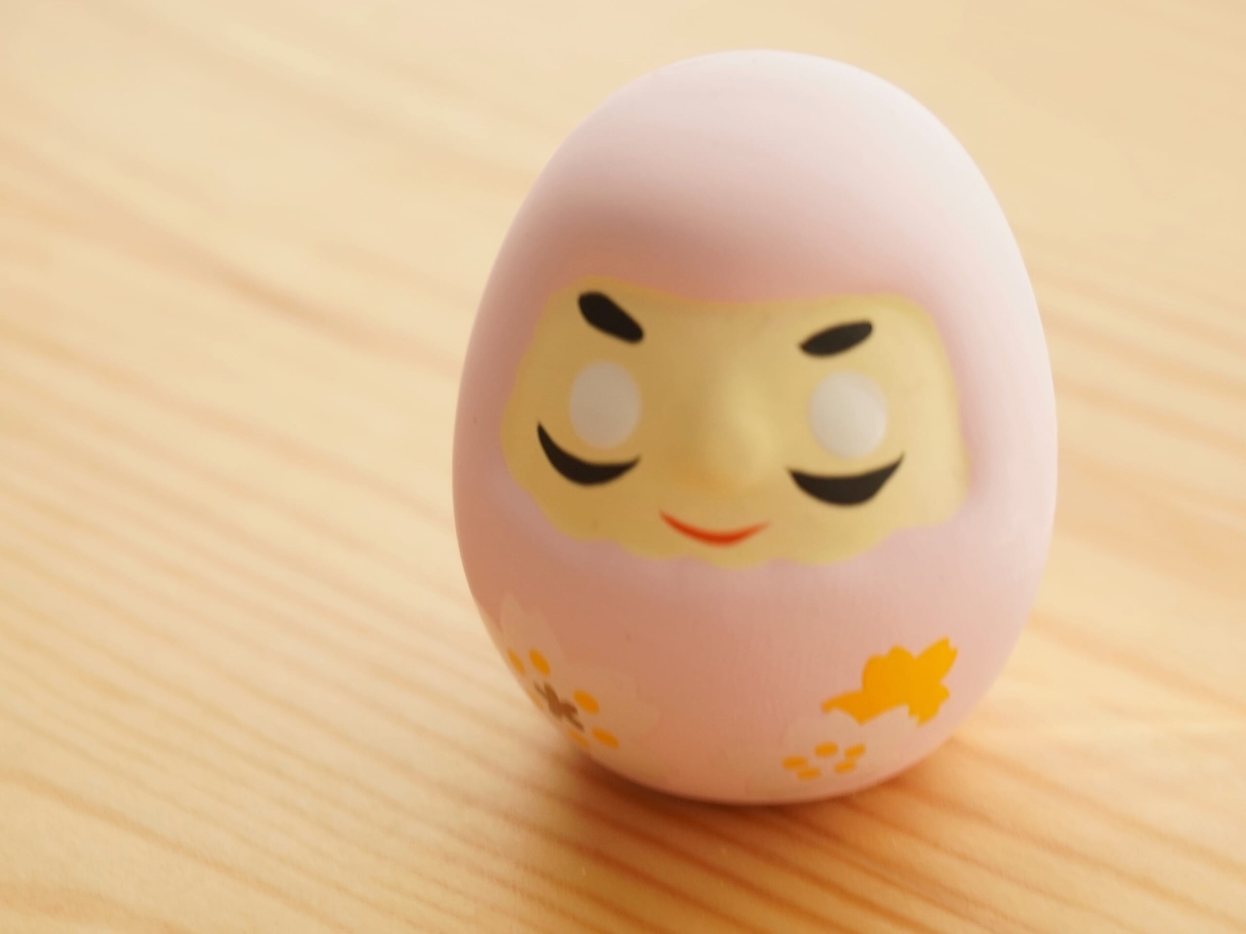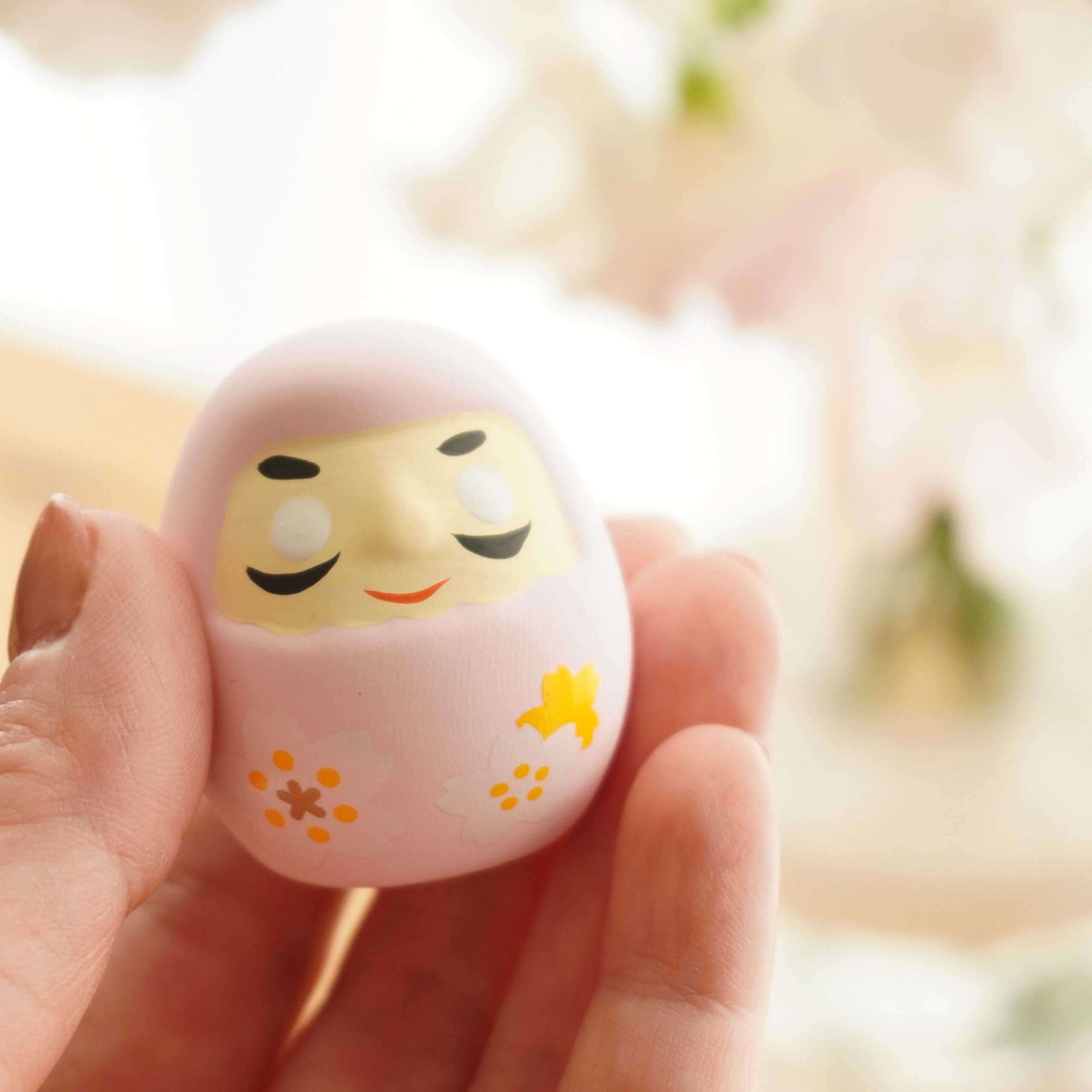 ころんっとした可愛らしい陶製のだるま。淡い桜色がとってもかわいい〜春限定のデザインだそうです。