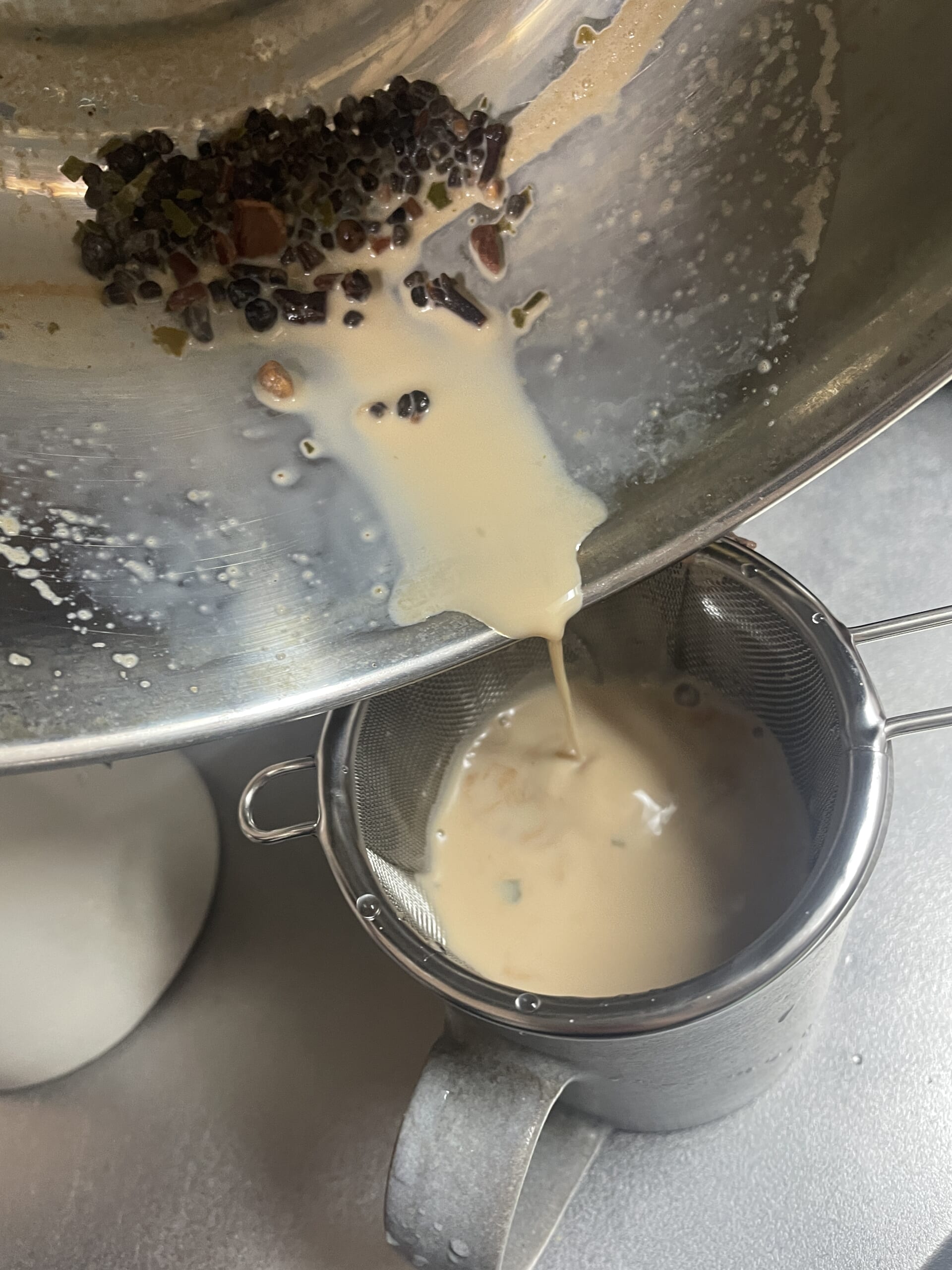 茶葉と一緒に煮出して、ミルクを鍋に足して、茶こしにかけます。茶こしはセリアで購入しました。