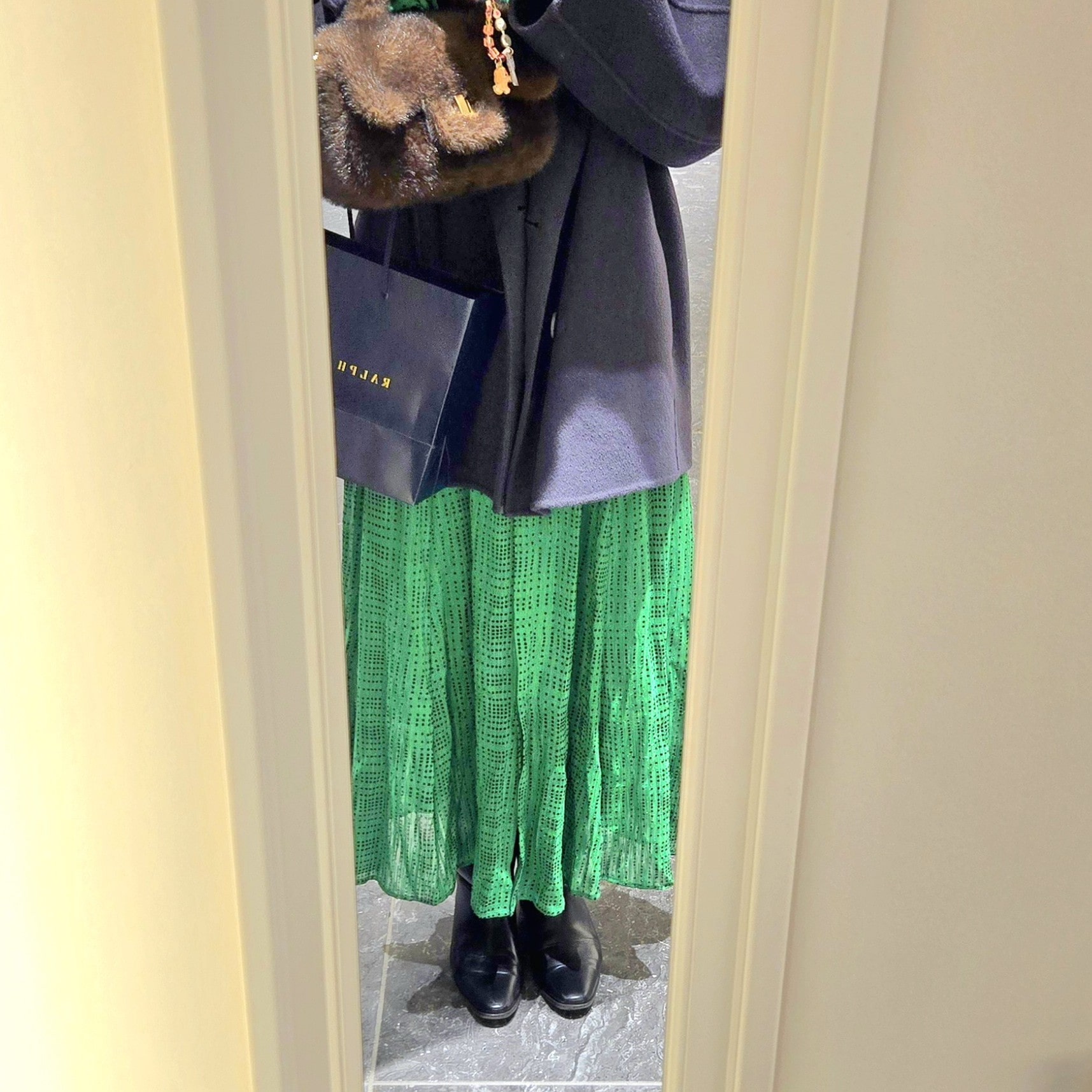 せっかくのロングブーツなので、私は思いきって大人のミニ丈?で合わせるのがお気に入りです♡少し膝が見えるかなー位だと、大人でも抵抗なく履きやすく感じます。この日はニットワンピと。(NICIのマスコットは息子からのプレゼント😂🩷)