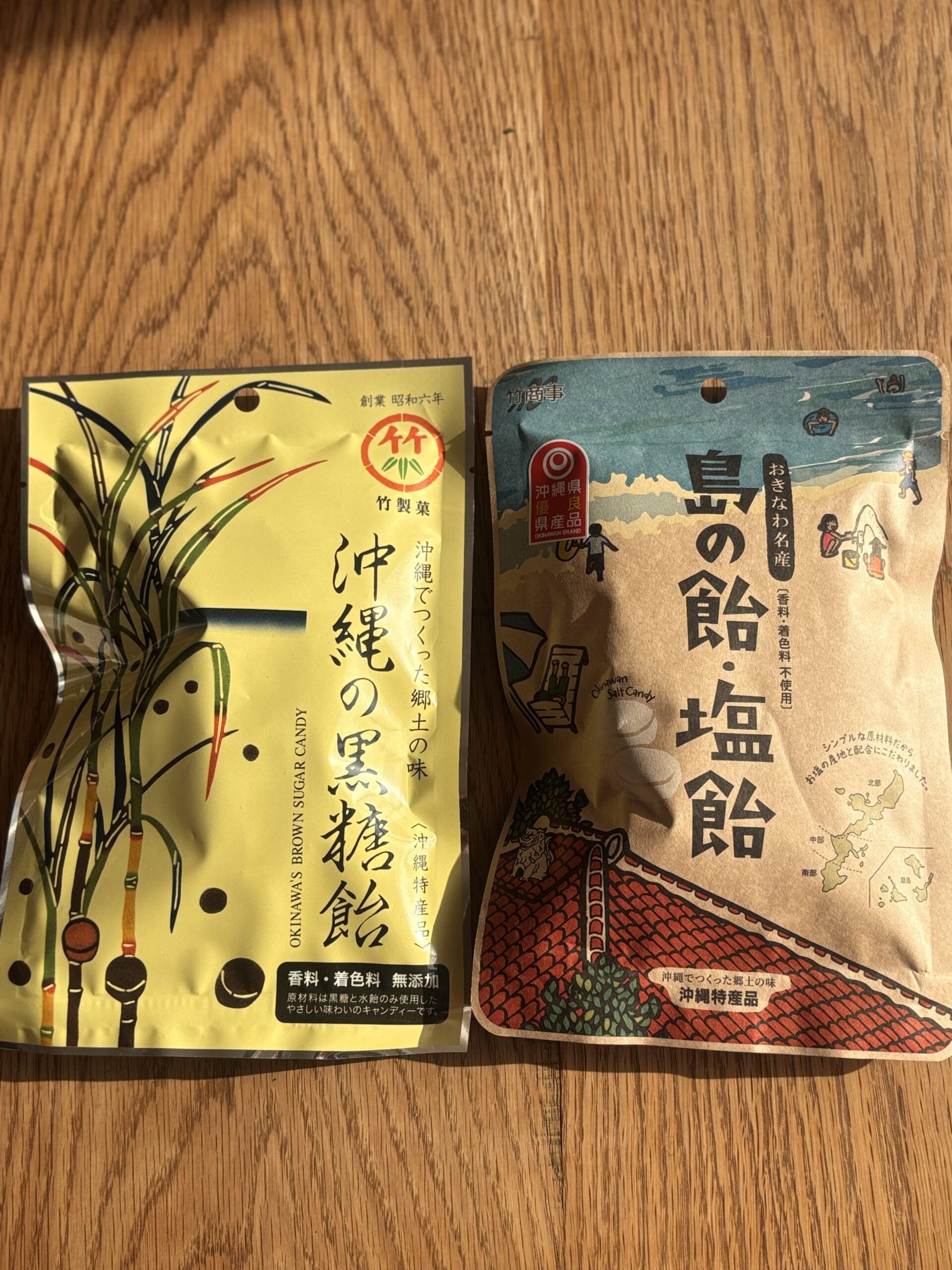 5年前にも購入した2袋。竹製菓飴2点。島の4つの地域の海水の塩を使った塩飴。塩加減が絶妙でとっても美味しいです。黒糖飴も無添加で優しい味わいです。