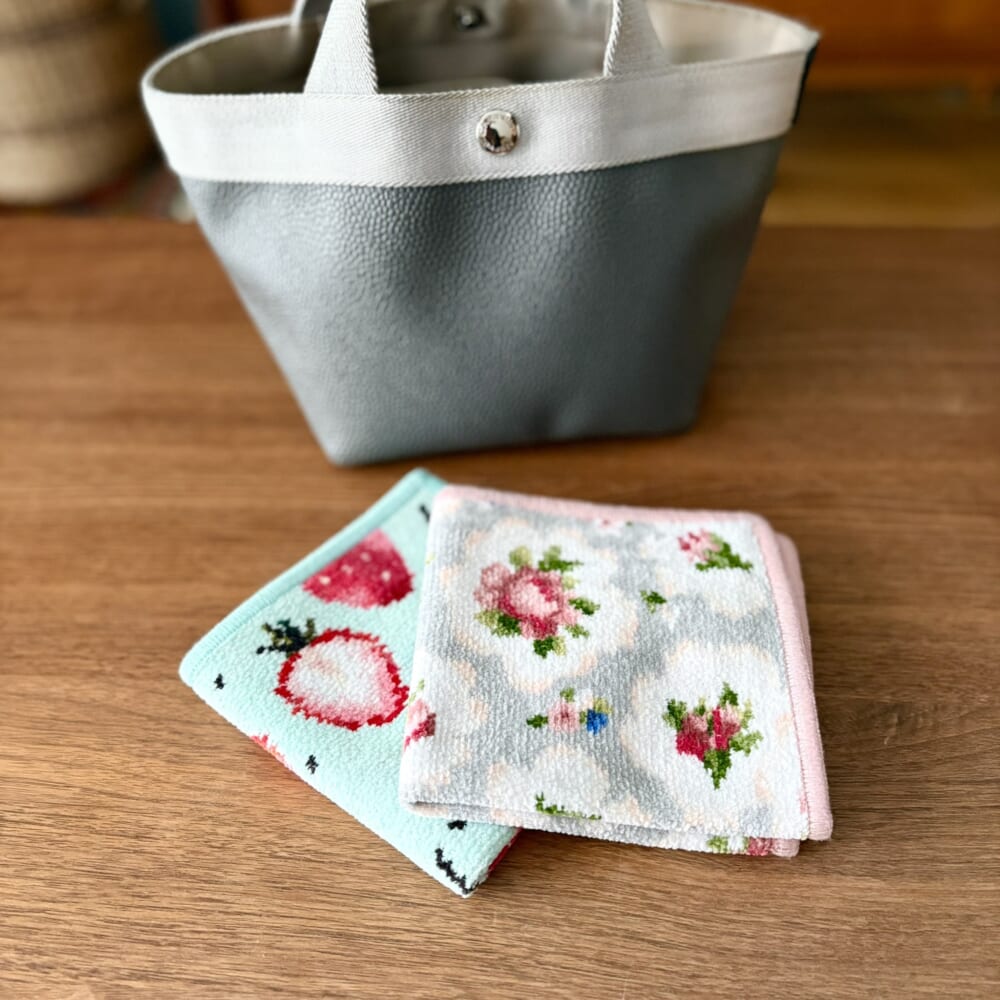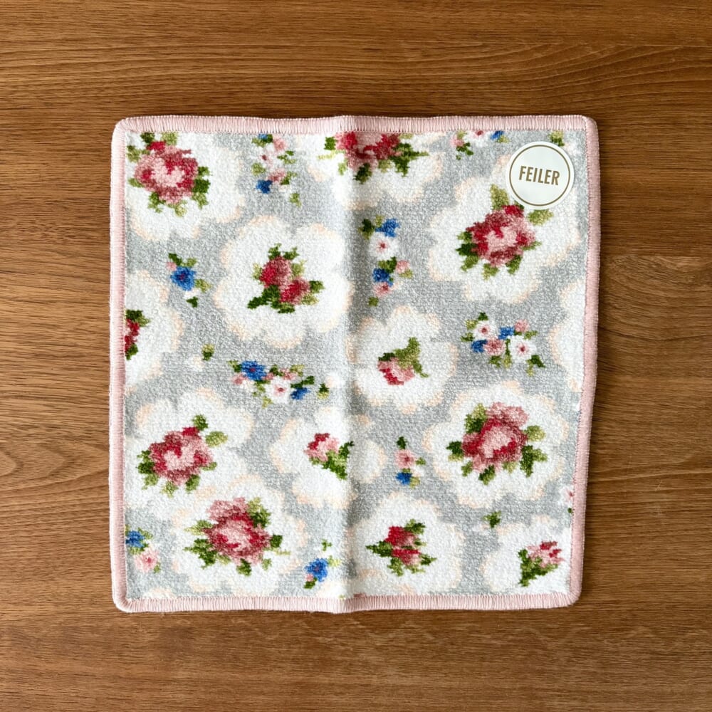 まずは最寄りのデパートにある「フェイラー」で、グレー地にピンクのフチ取りが愛らしいお花柄のこちらを。優しい雰囲気で、ラブリー過ぎないところが気に入っています。