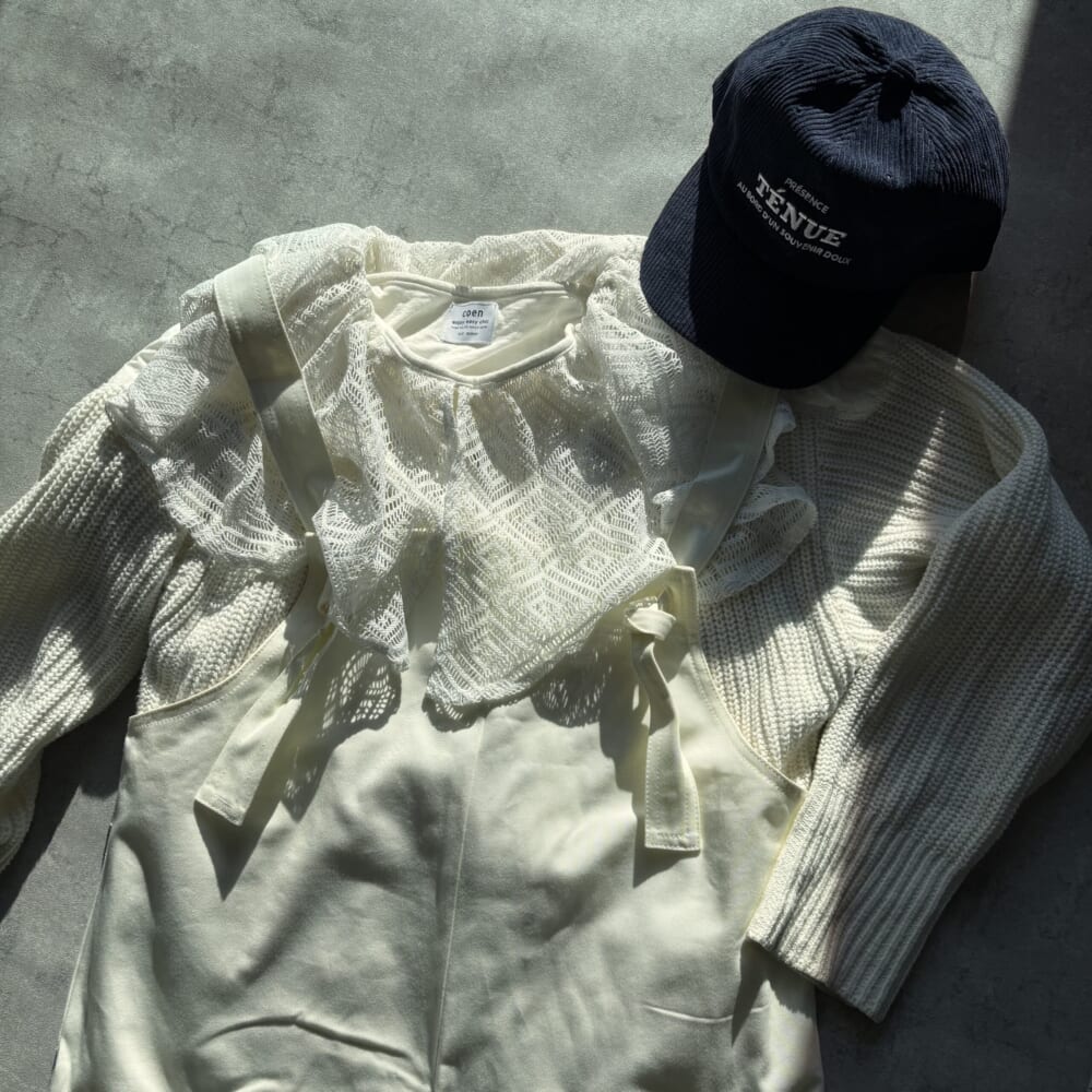 サロペットの中にざっくりニットのカーディガンとフリル襟のカットソーを仕込んでみました。サロペット自体がややゆとりのあるデザインなので中にも着込めるの嬉しい。