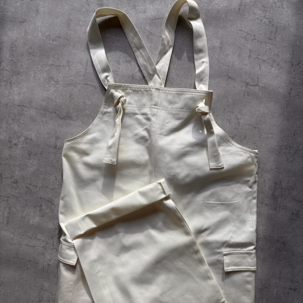胸当て部分は紐が玉結びになってて、こちらも好み。カジュアルなデザインではあるけれど、胸当て部分にポケットが付いていないから子どもっぽくならず、大人カジュアルコーデに最適♡