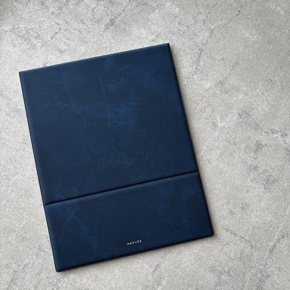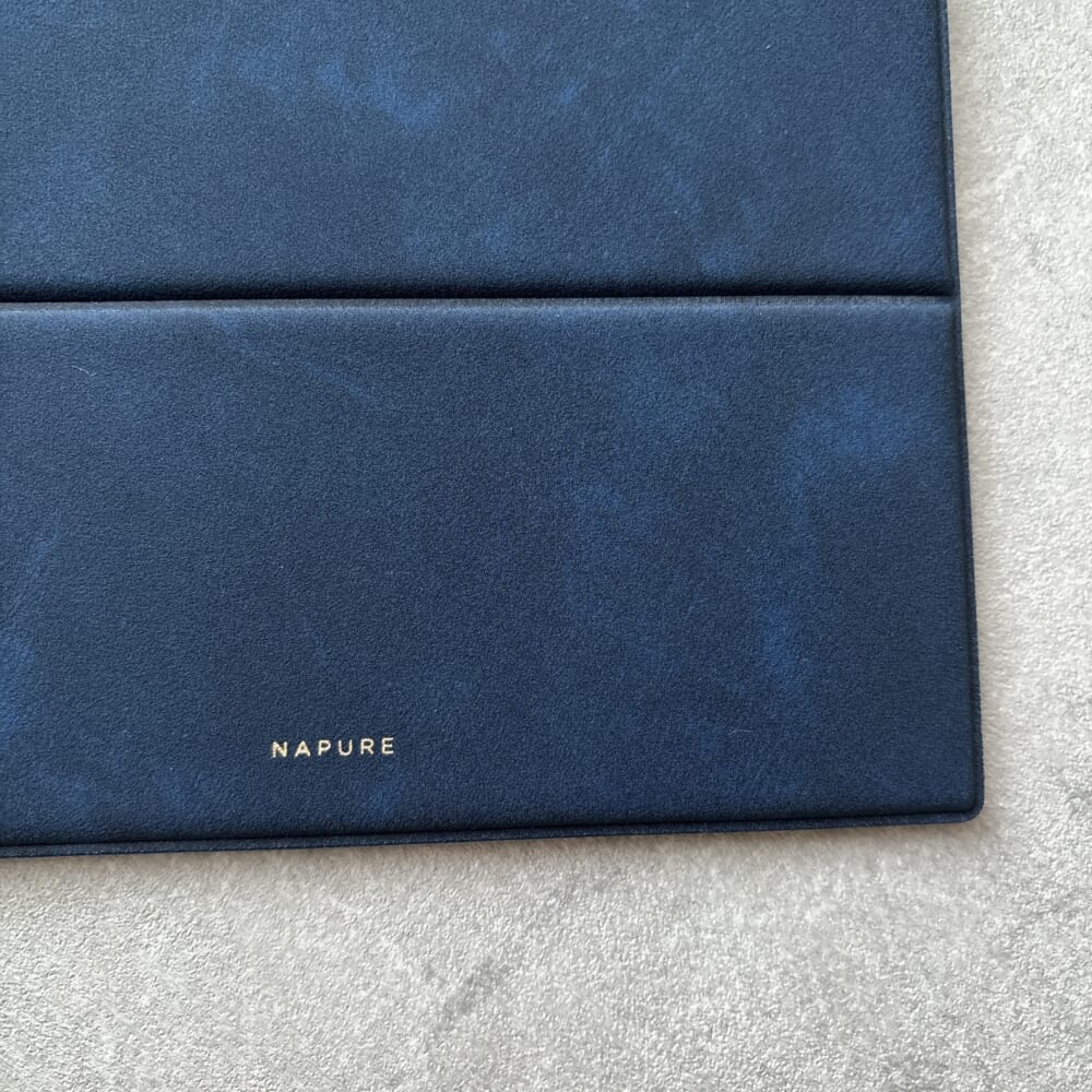 高級感のある紺色のカラー。素材はPVC樹脂で触るとビニールっぽくて汚れが付きにくい素材。でも見た目はレザー調で、よく見るとまだら模様の紺色。