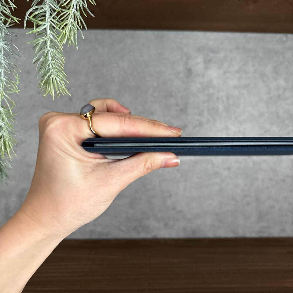 畳んだ状態でこの薄さ。すごくスタイリッシュ。薄いので軽いのも嬉しい。
