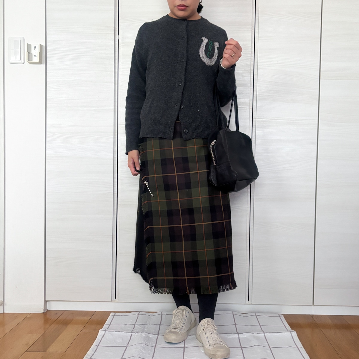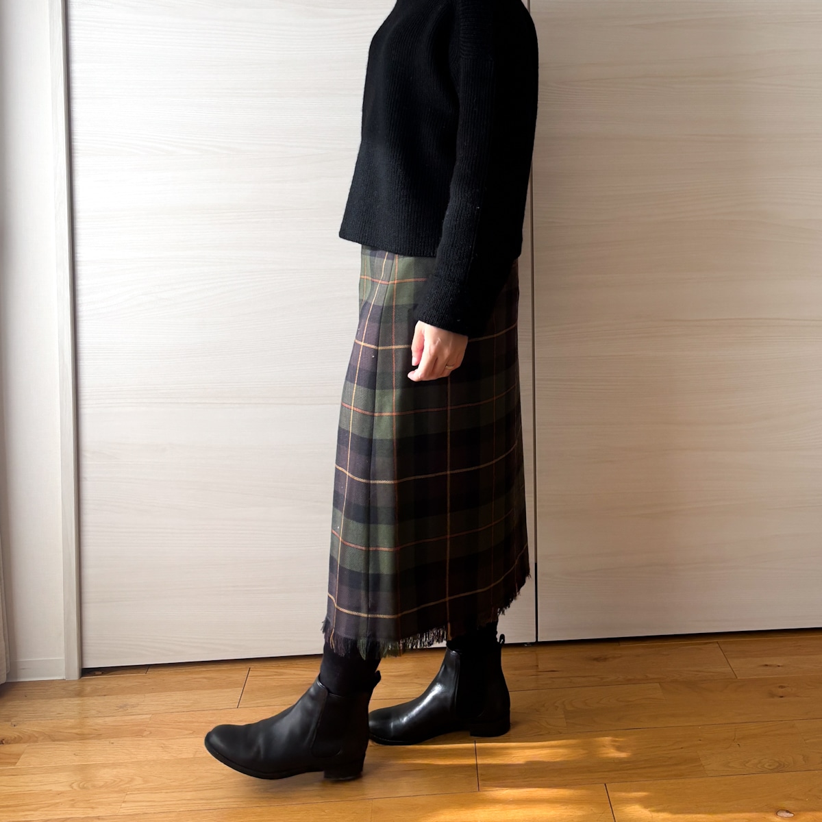 欲しいと思ってお気に入りに入れていたオニールは83cm丈。このスカートは73cm丈。10cmも短いのはどうかなぁと思いながら試着してみましたが、実際に着てみると「案外いいかもしれない!」思えました。ロング丈をずるっと着るのもいいけれど、ミディアム丈は軽やか。低身長な私にはミディアム丈の方がバランスがいい……かも。