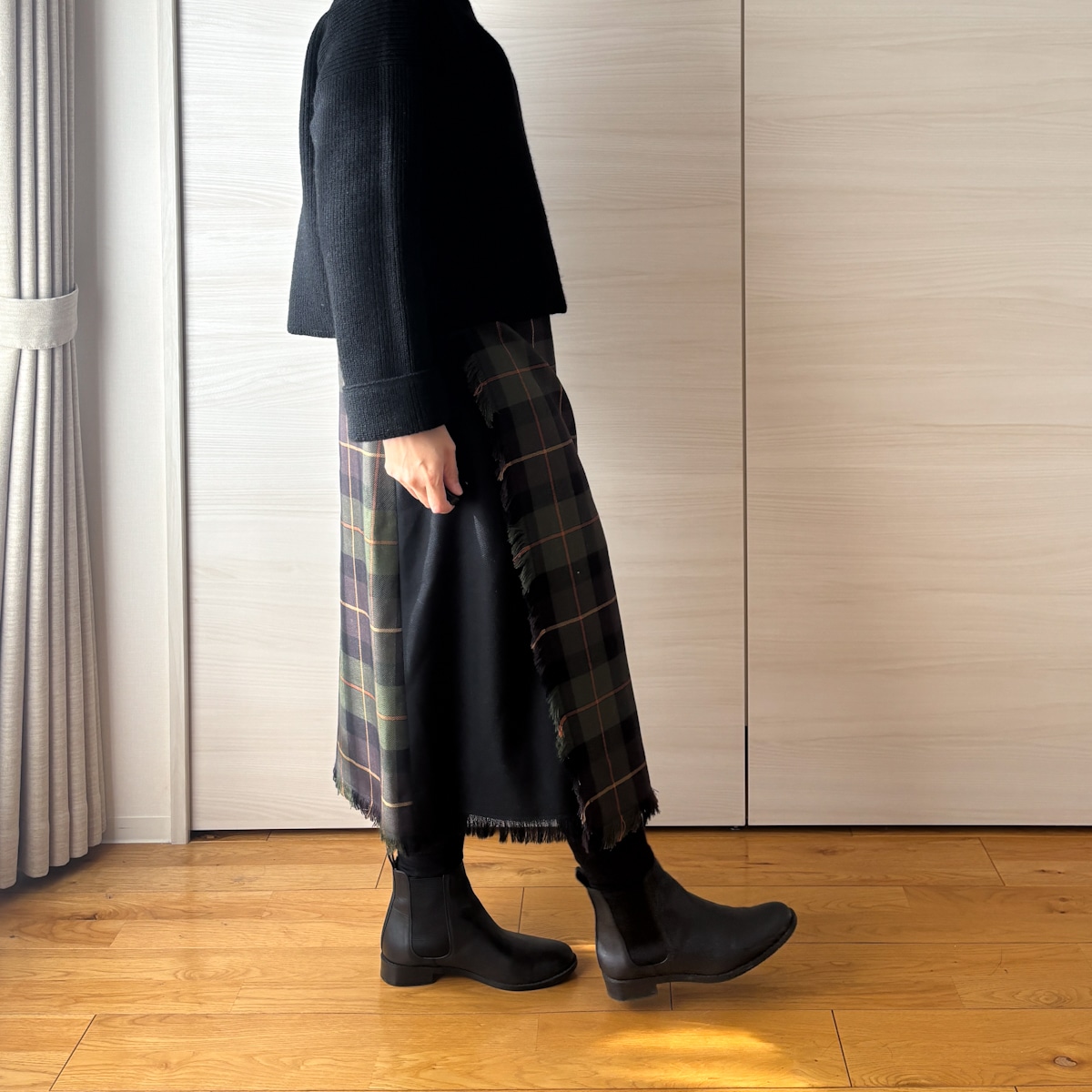 黒のショート丈ニットと、ショートブーツに合わせました。写真には写ってないのですが、ショート丈ニットだとウエストの太めのベルトも見えます。