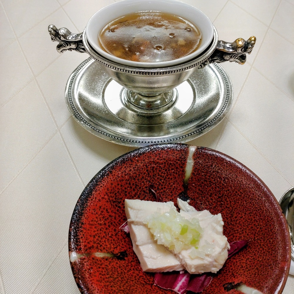 検査が無事終わったあとの蒸し鶏と中華スープ。人間ドックのご褒美にホテルのランチ券を利用しました。