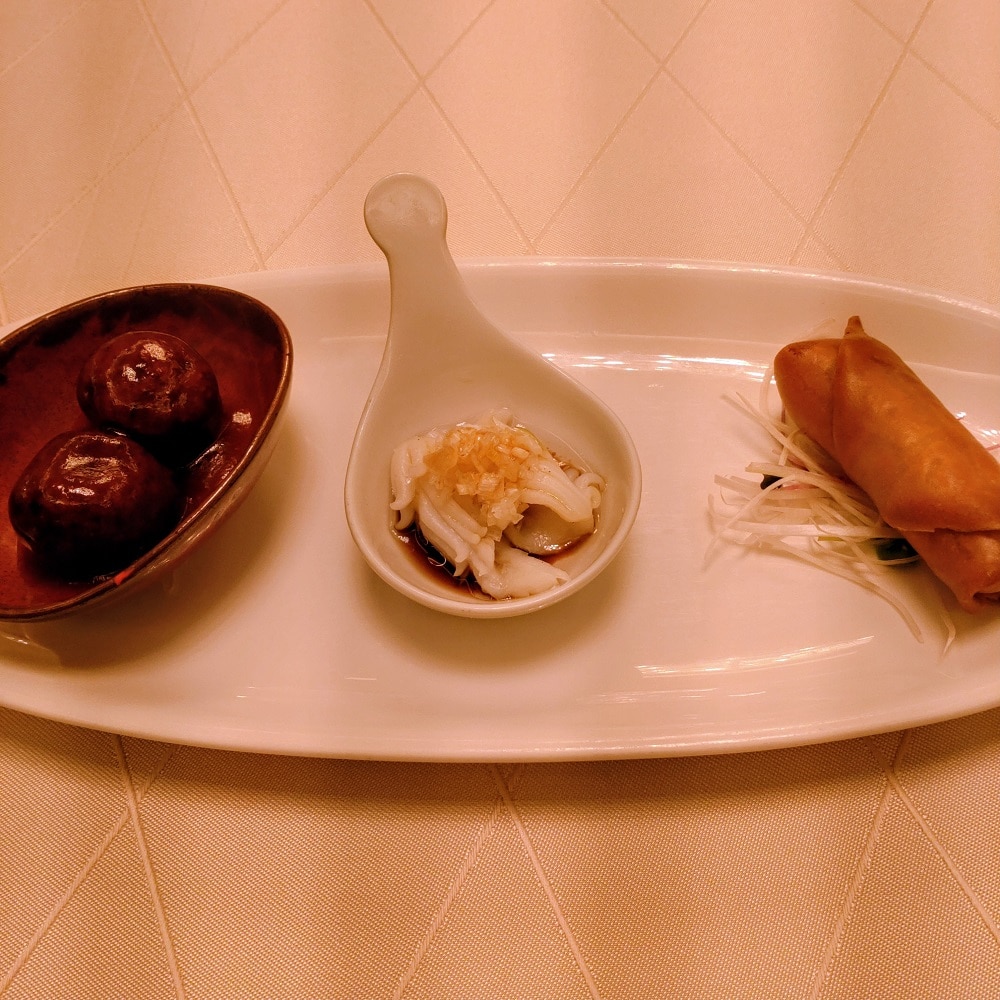 肉団子、イカのなんとか(うろ覚え)、春巻き。一仕事終えたあとのおひとりさまランチは最高です。