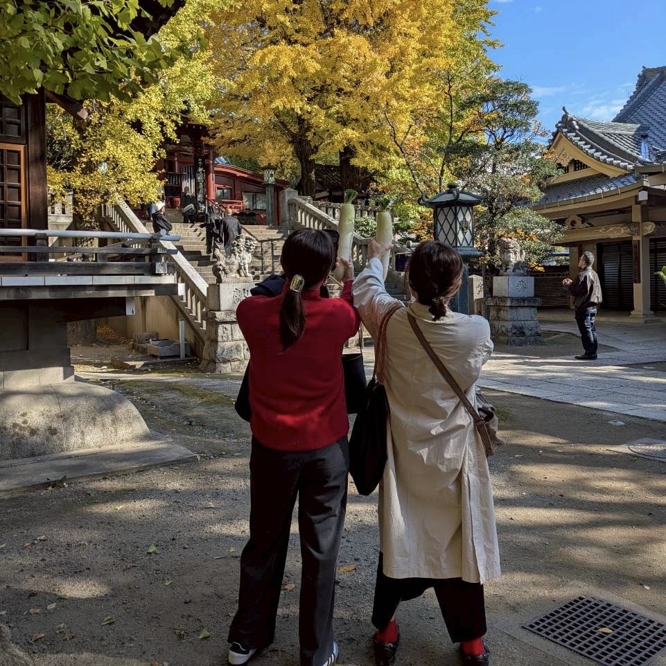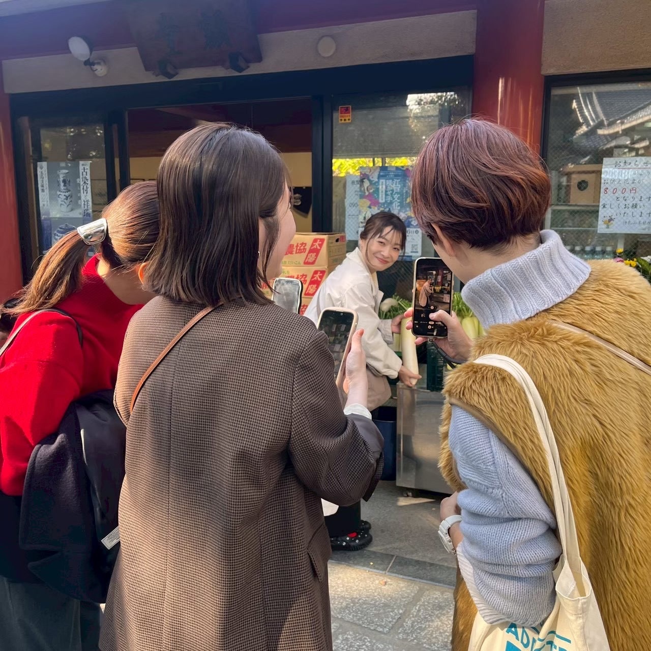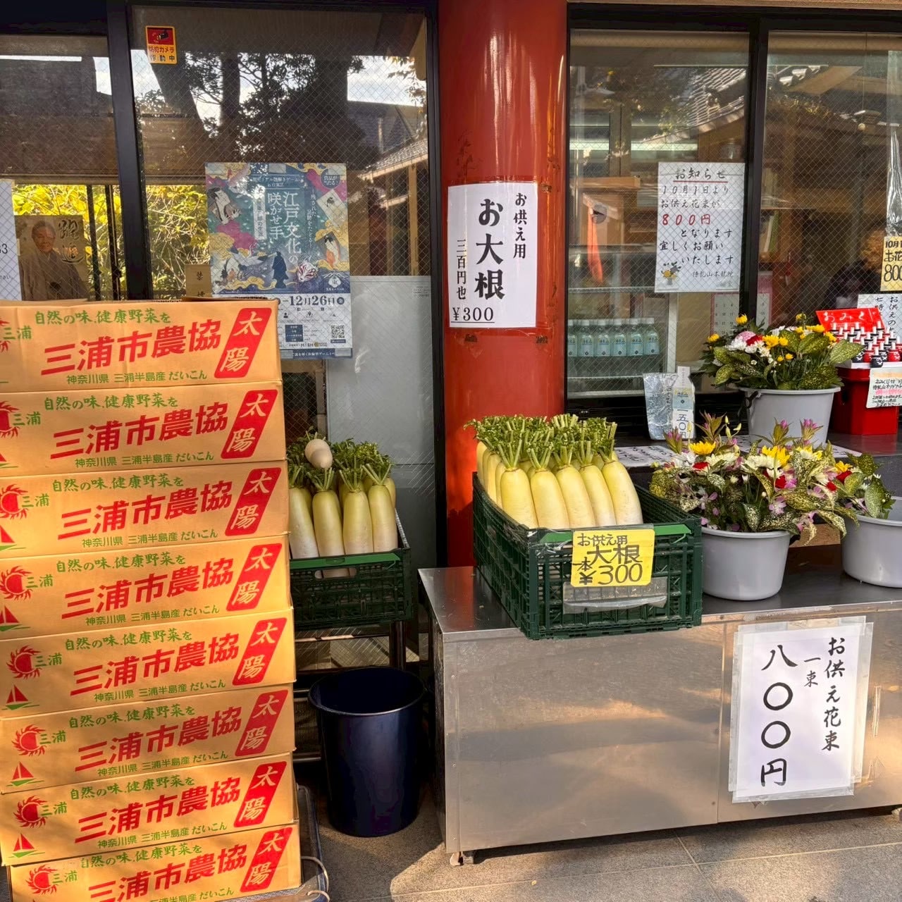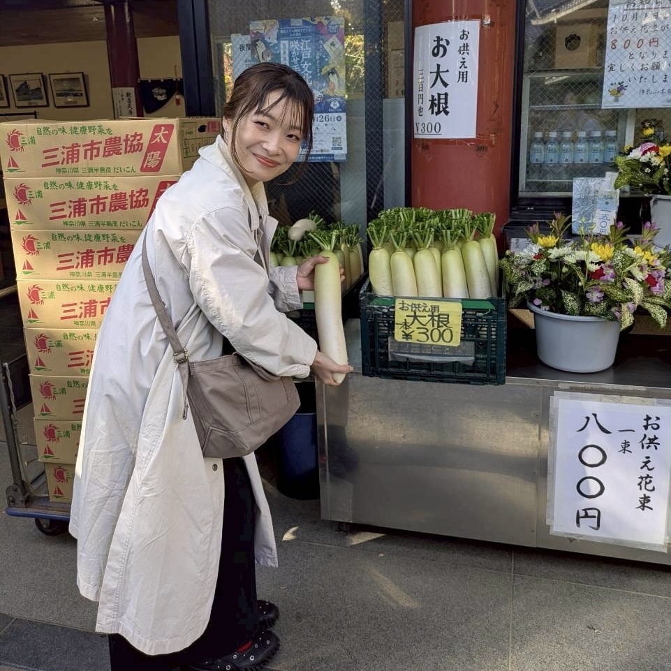 スカイツリーも見える浅草近くのこの神社で。東京に来て、大事に大事に大根を抱える。きっと娘は今頃「お母さんどうせ東京でオシャレなカフェとか行ってるんでしょ」とか思ってるだろうけど、母は今、大都会東京で大根を抱えています。