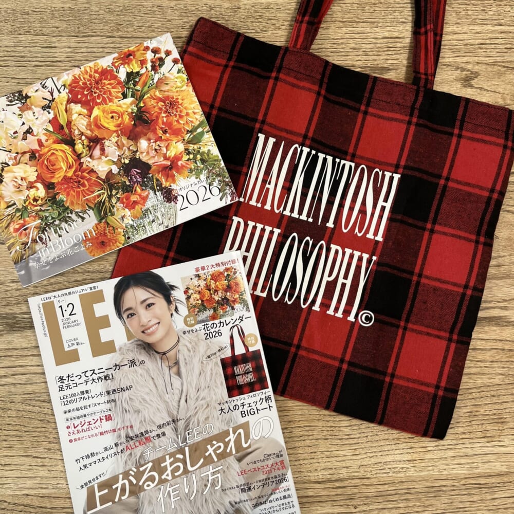 通常版には「マッキントッシュフィロソフィー 大人のチェック柄BIGトート」と「LEEオリジナルカレンダー2026」という特別付録がついてきます(コンパクト版にはミニサイズのカレンダーのみつきます)。