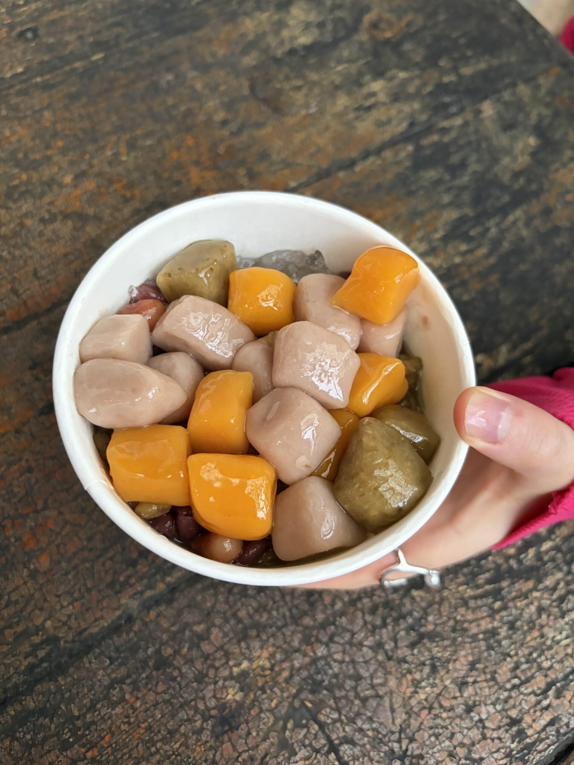 ずっと見てられる、てりってりな画。芋圓(ユーユェン)とはもっちもち芋団のことです。このお団子はタロイモや、さつまいもから作られる芋だんごだそう。もっちもちでした。そのほかにはあずき・緑豆・金時豆とうれしい豆3兄弟。ちいさな氷もはいっていてやさしい甘さで止まりません。