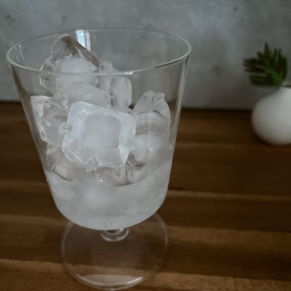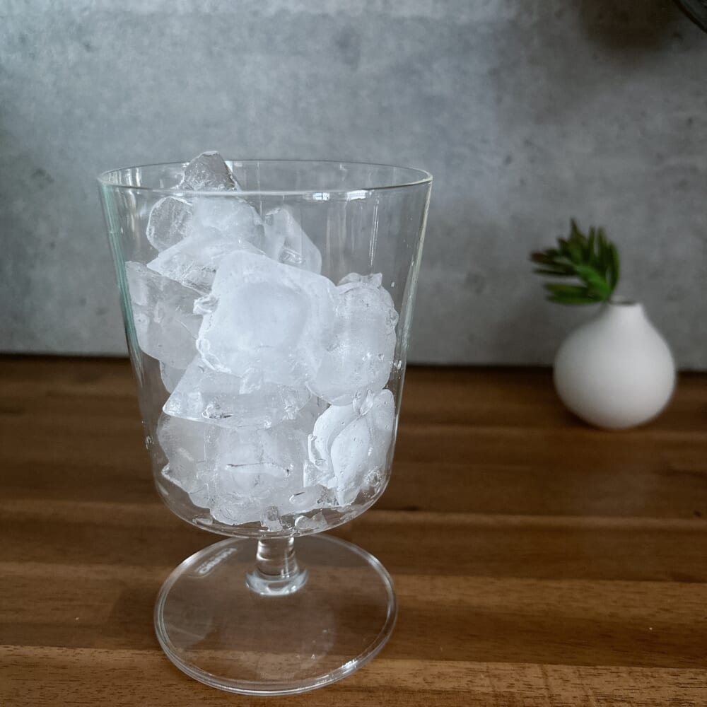 さぁでは作っていこうぞ。まずはグラス一杯氷を入れます。