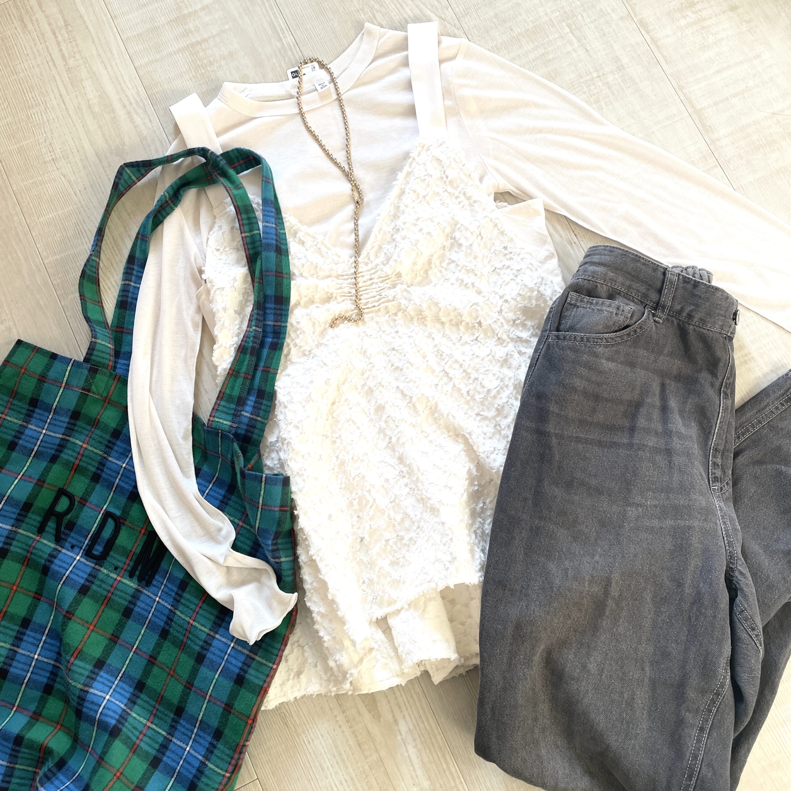 春になったらスキントップスを中にINして、ブラックデニムのモノトーンコーデにゴールドのネックレスと、お気に入りのチェックパックを。