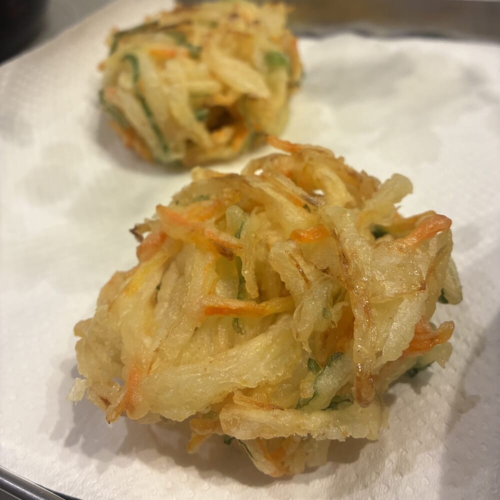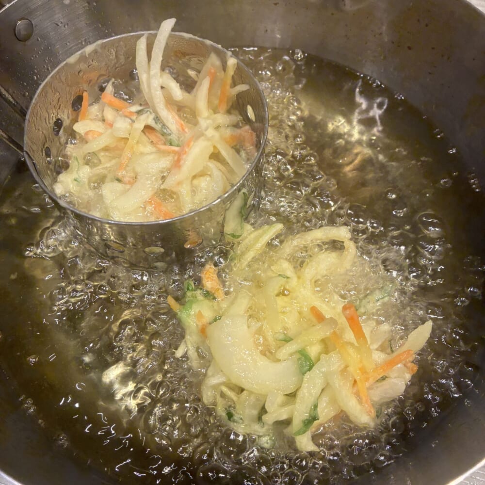 マリオカートで無敵になったときのように、目の前の天ぷら鍋がレインボーの輝きを放つ中(目の錯覚)、次々と綺麗なかき揚げを量産していきました!