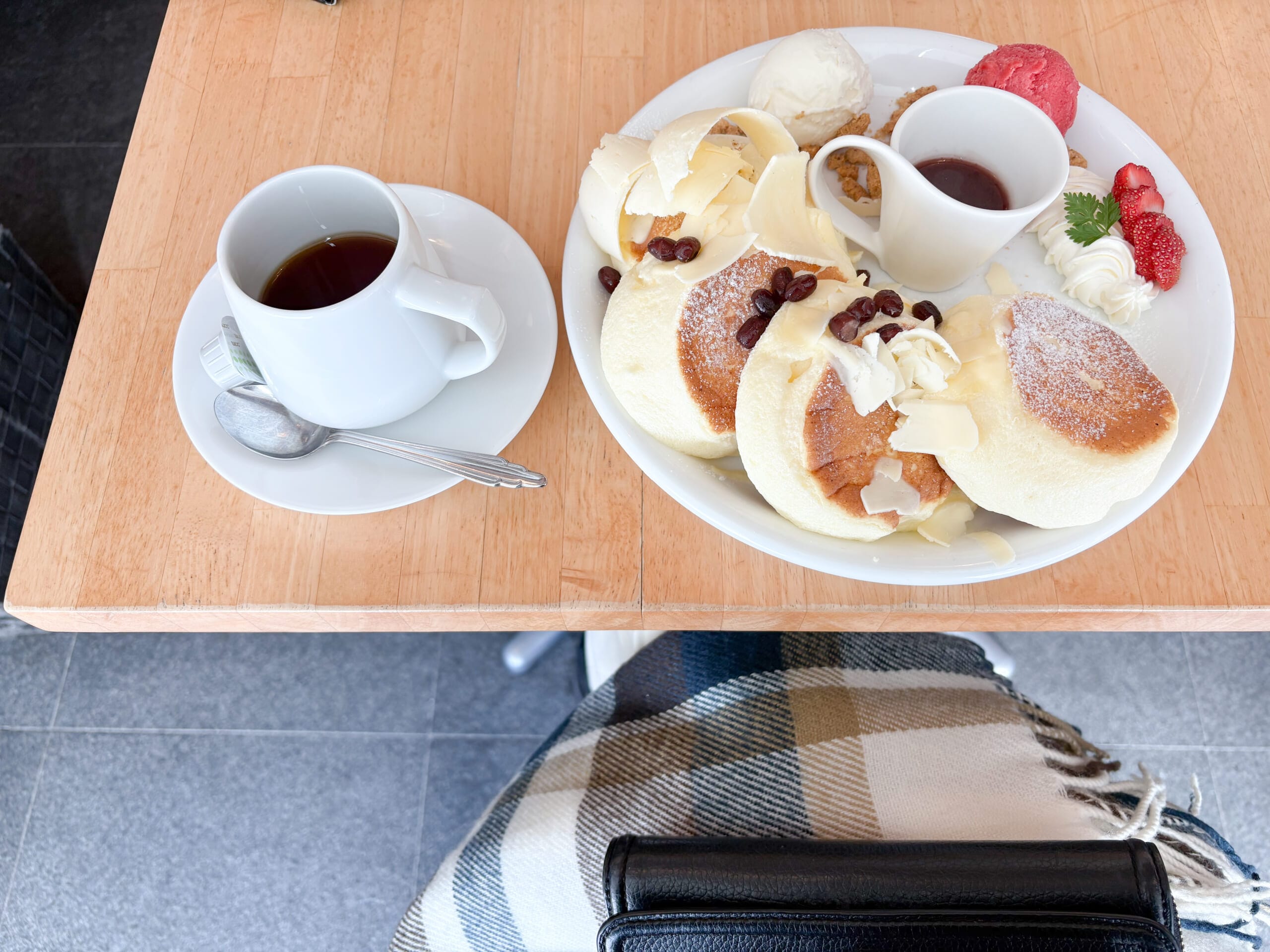 前回は夏に来たので、冬に訪れるのは2回目。またこの冬景色が雰囲気があって素敵でした。このカフェは、”ふわふわパンケーキ”と”季節の旬のフルーツを使ったパフェ”が楽しめるスイーツカフェです。特にパンケーキは、スフレのようにとろけるふわふわ♡ということで人気のカフェです。