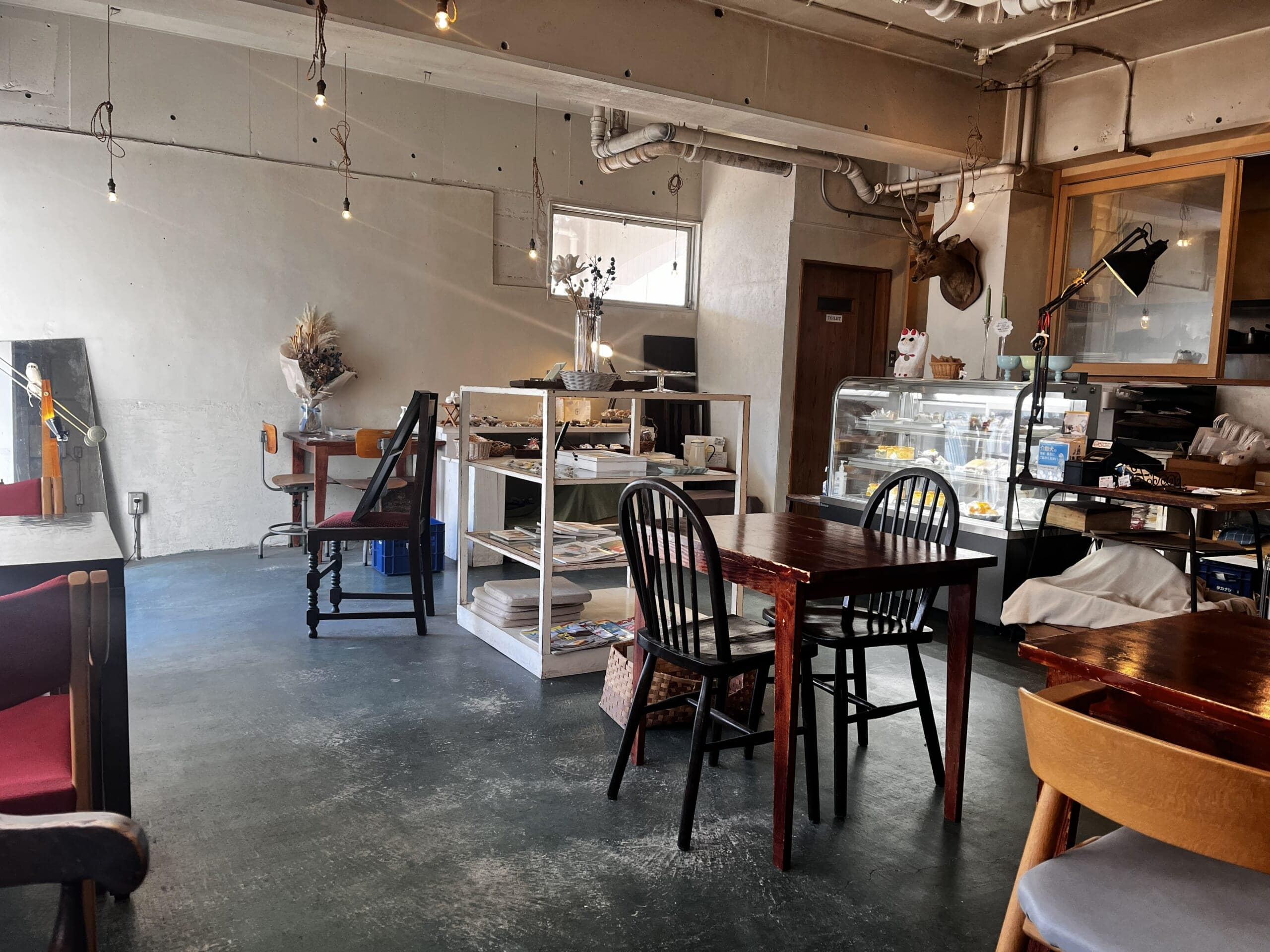 店内も素敵でアンティークの家具や雑貨が飾られていて、打ちっぱなしのコンクリートと雰囲気が合っていて素敵な空間です。ただ、ひとつ忠告しておきたいのは、冬場はおしりが冷たいという事です。