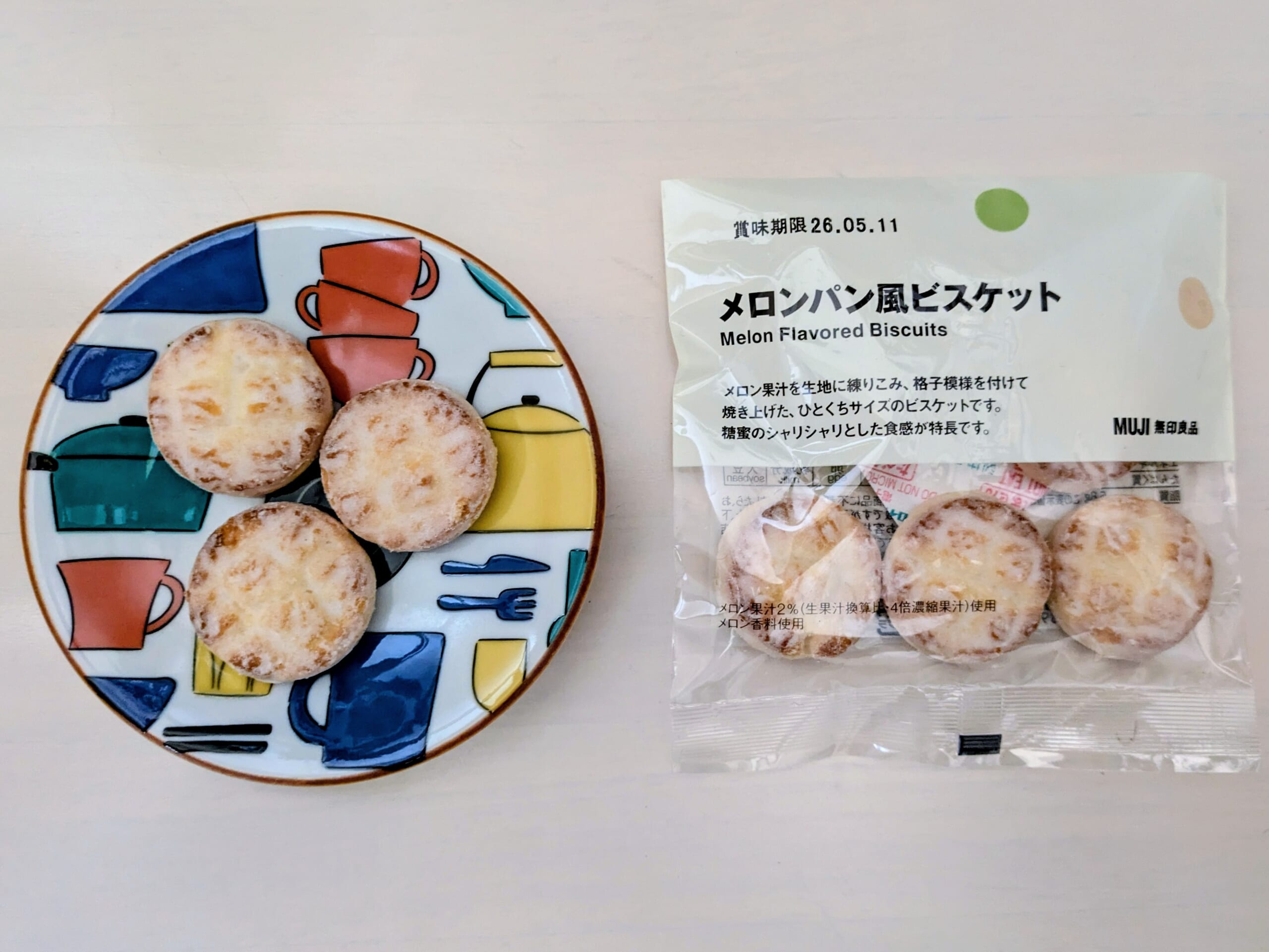 シャリシャリとした砂糖の食感と、メロン果汁の風味、そしてメロンパンといえばの格子模様が再現されており、ひとくちサイズでとても食べやすいビスケットです