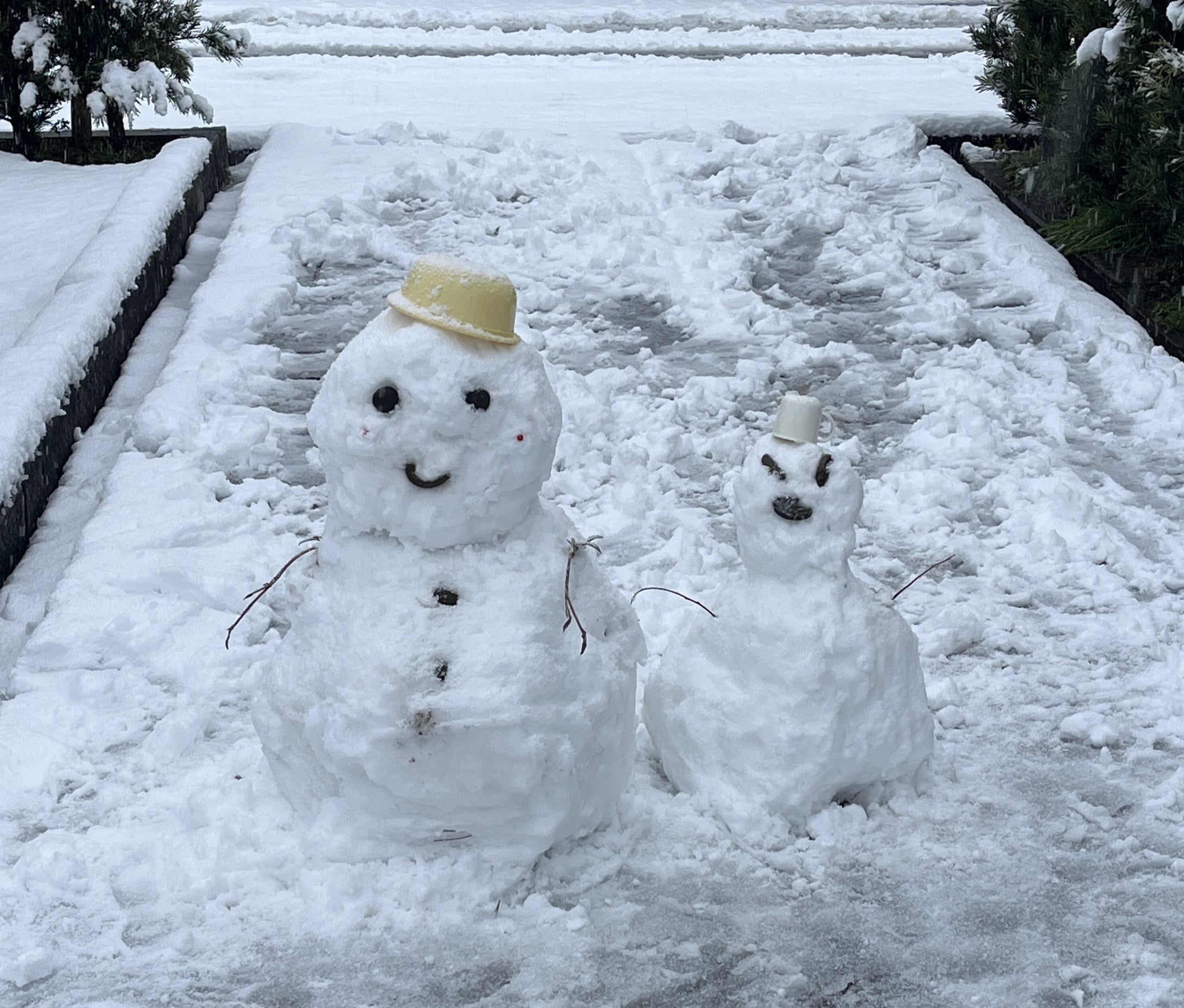 完成したのは、洗面器とコップをかぶったかわいい雪だるま、ふたつ