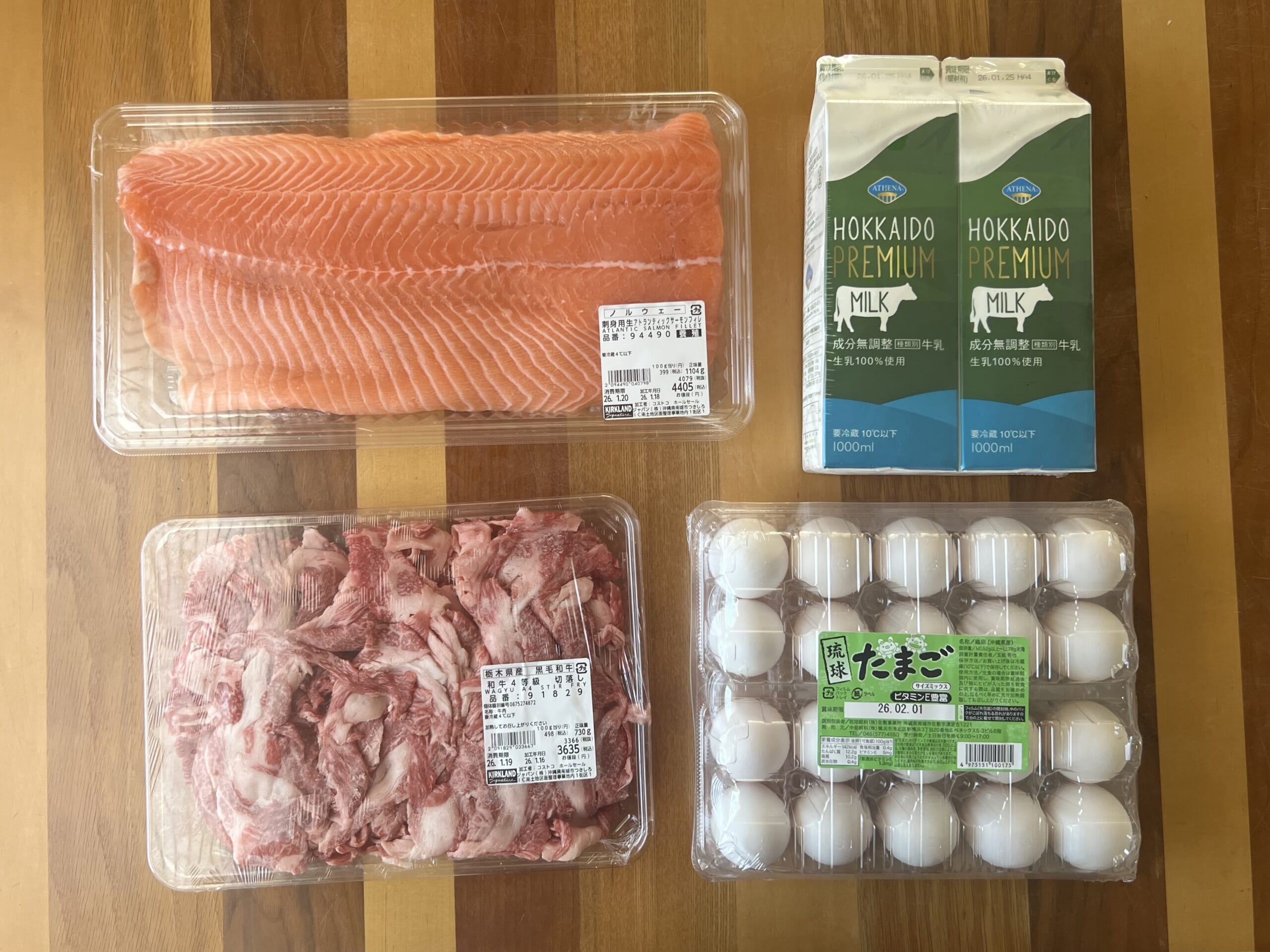 コストコの刺身用生サーモンも本当に美味しいと思う。ただ、値上がりが激しくて特売になっても特売に感じない(涙)。牛乳はお家でヨーグルトを量産しているのですぐ無くなる。もれなくたまごも消費が早い。今回買った和牛の切り落としは栃木産。いつも買っている北海道産より歯ごたえあり。