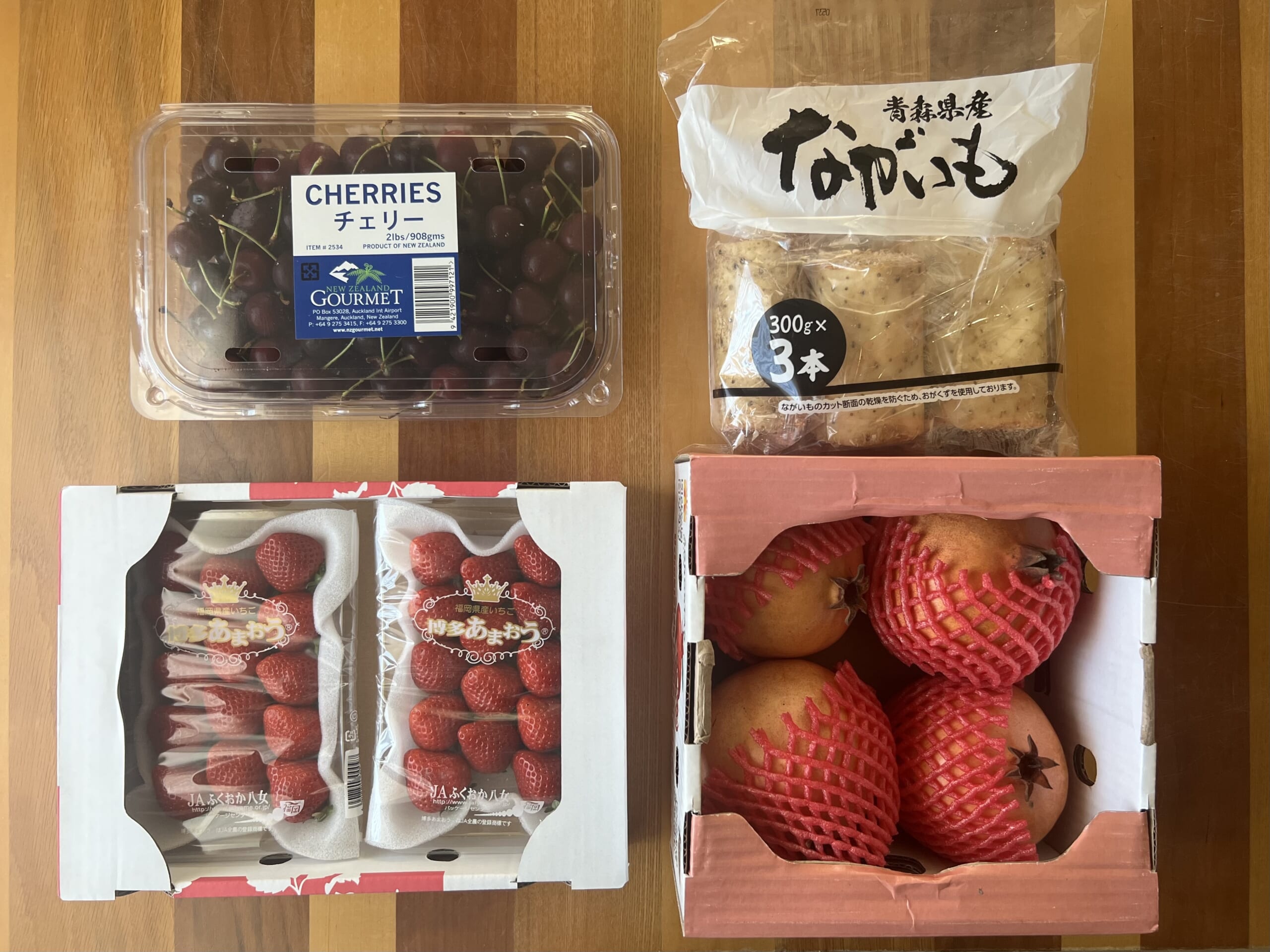 季節を問わず、とにかくフルーツをたくさん食べたいわ。試食で食べたあまおうが美味しくて、これはもう抗えず、そのままお買い上げ。ニュージーランド産のチェリーは、いつも買っているアメリカ産より甘さ控えめ。ザクロも今回はアメリカ産ではなく、初めましてのウズベキスタン産で、こちらも色も甘さも控えめでした。