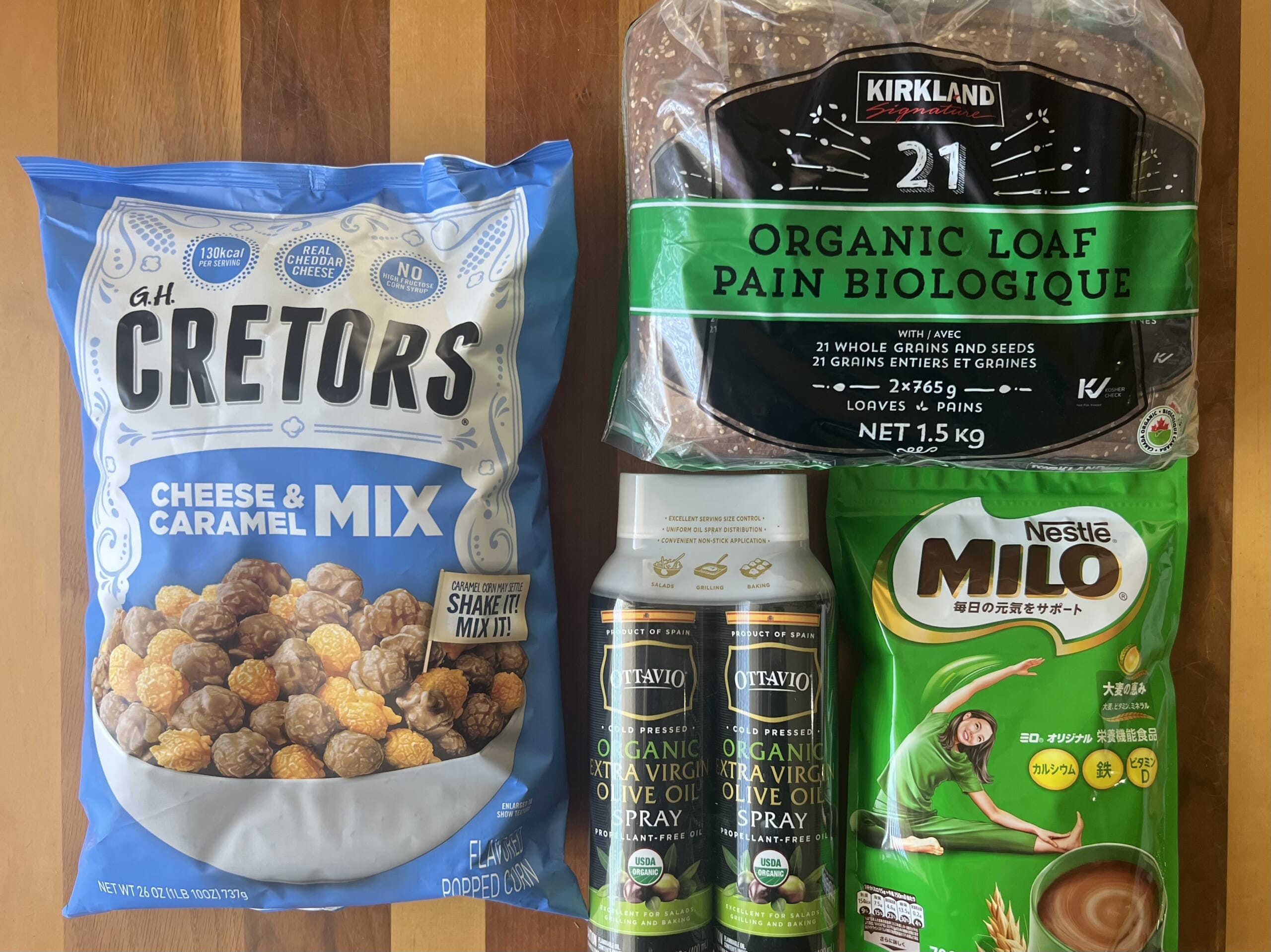 日々、頭の中ではあれ書こう、これ書こう、この内容イケてるしとか、この一文もはや名文では?(うししし)とか、メンバーのクリップへのコメントも、脳内では毎日密かな自己満足ベストセラーが量産されていて、「よし、そろそろブログとコメント書こうか」と、なぜかやる気だけは満票で可決されるのに、ブログに向かう時間がなかなか取れず、やっとパソコンを開いた頃には、あの熱気はどこへやら、画面に残るのは、びっくりするほど普通な文章だけ。脳内会議、解散が早すぎるー!という事で(?)、難しいことは考えず、最近のコストコ購入品をご紹介していきたいと思います。ちなみトップ画像はお気に入りのパン、ポップコーン(チーズのみも売って欲しい)、便利なスプレータイプのオリーブオイル、おおきなミロ。