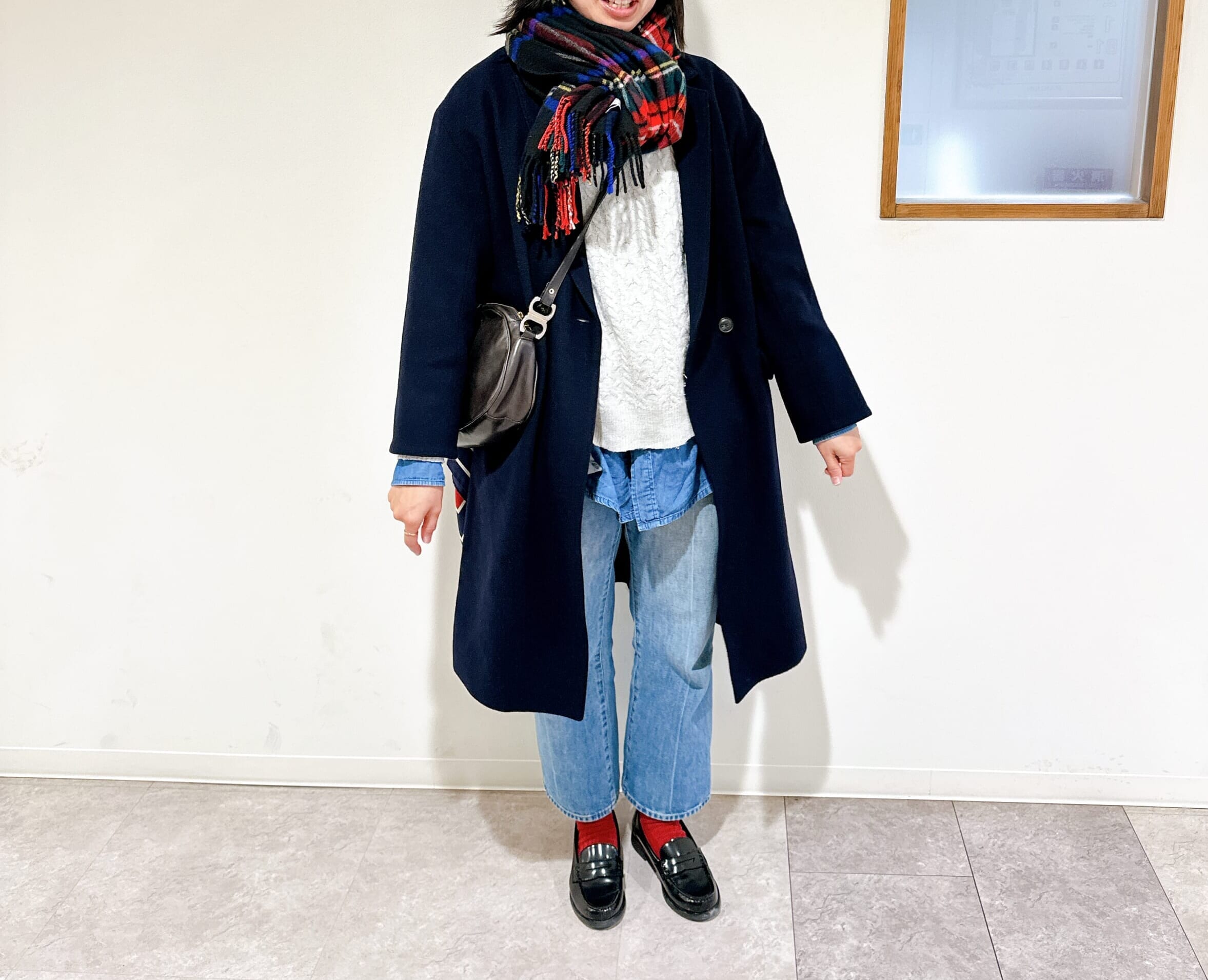 ネイビーのコートと、チェックストールと合わせると、ロンドンぽい着こなし!