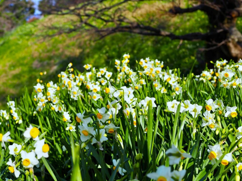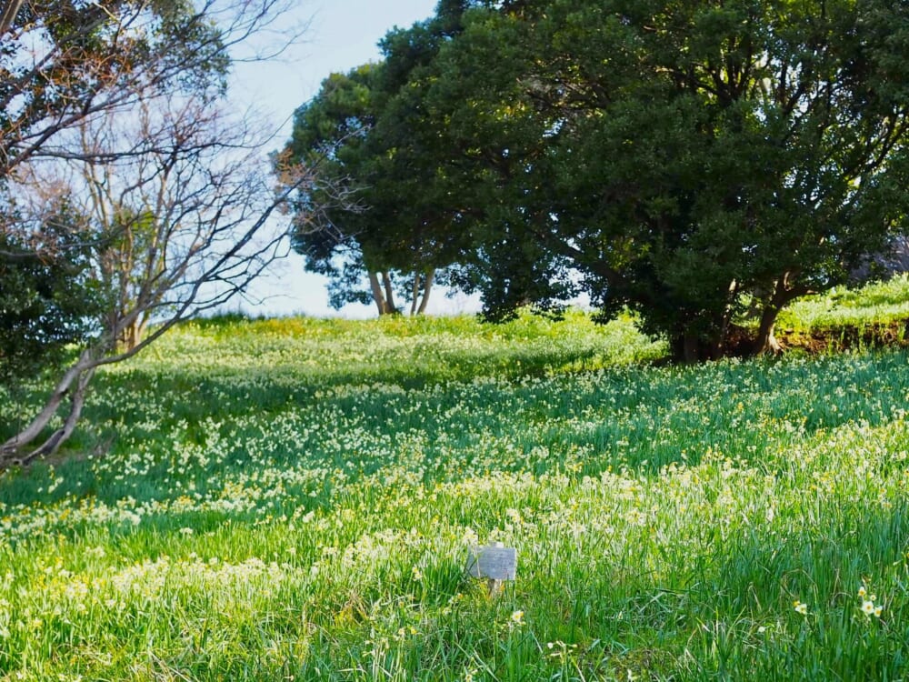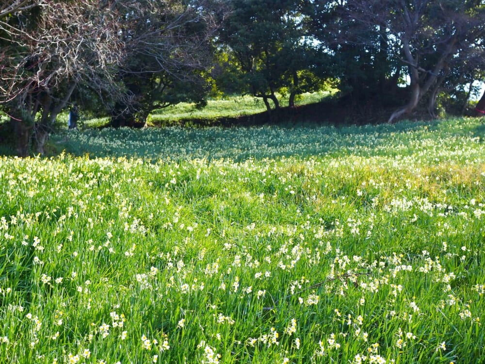なお、水仙畑の間に遊歩道や階段が整備されて歩きやすいのですが、水仙が咲いている場所は急な斜面なので、小さなお子様と一緒の場合は注意が必要かと思います。