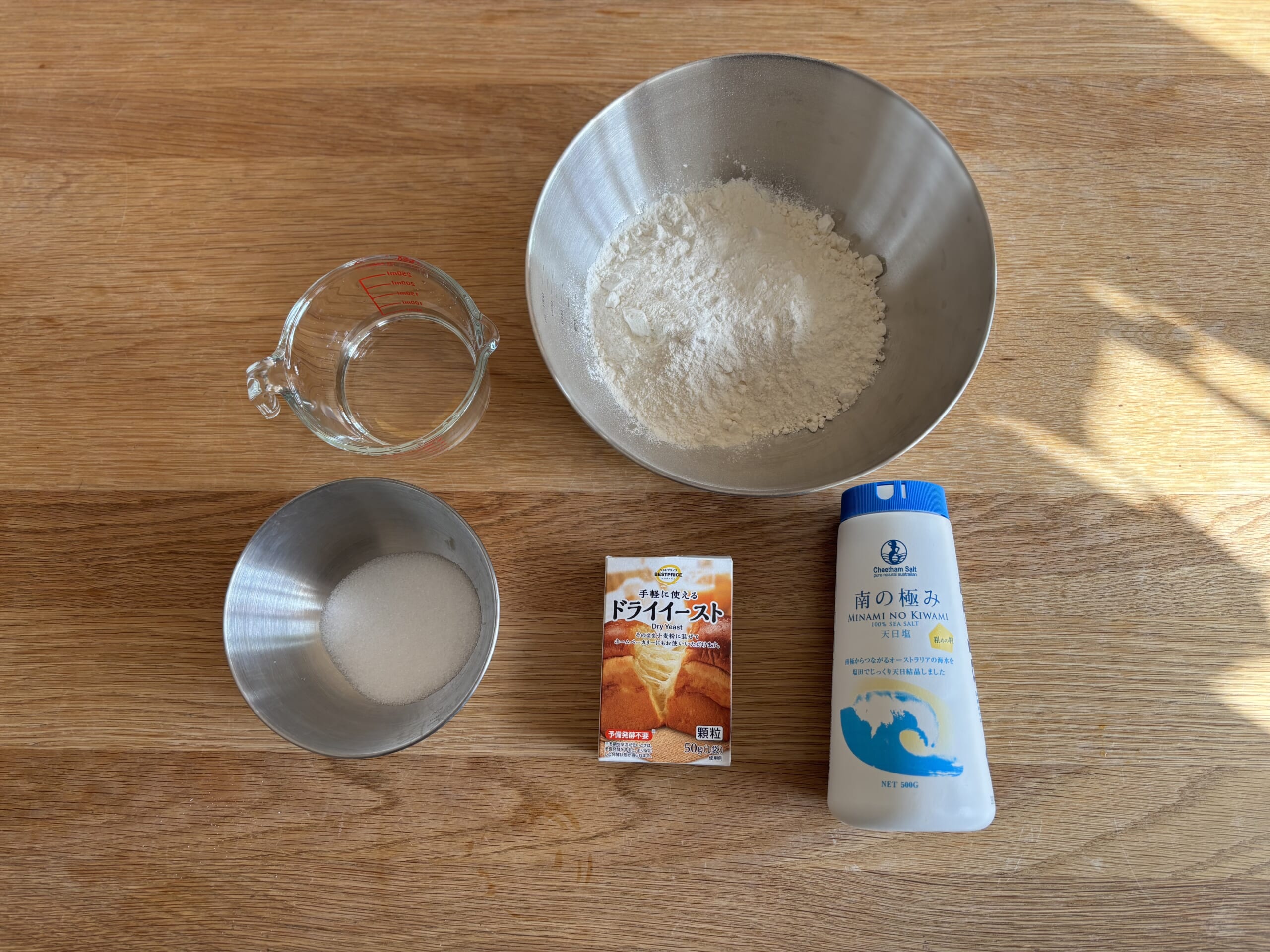 小麦粉、強力粉、塩、グラニュー等、イースト、油、水。