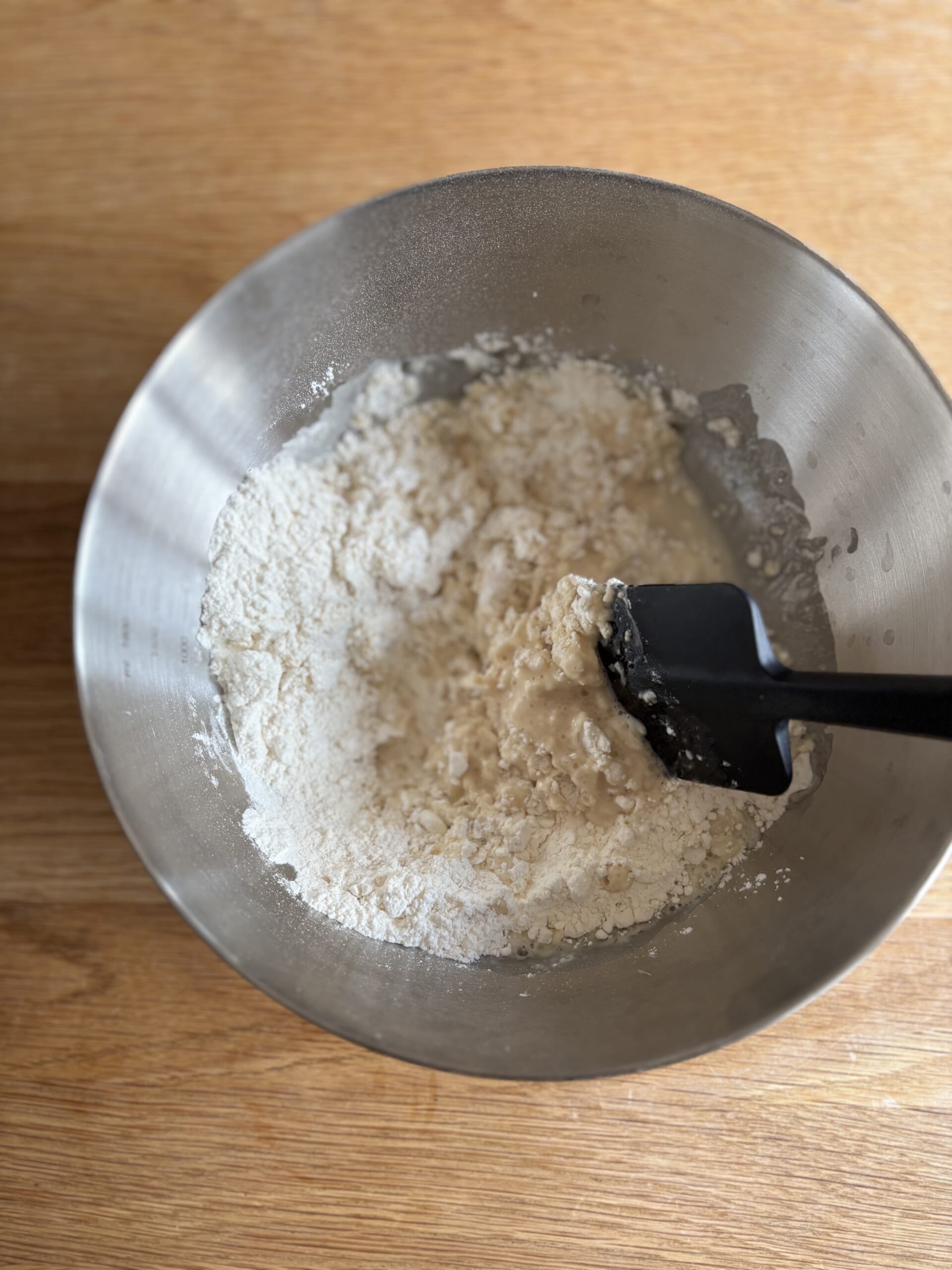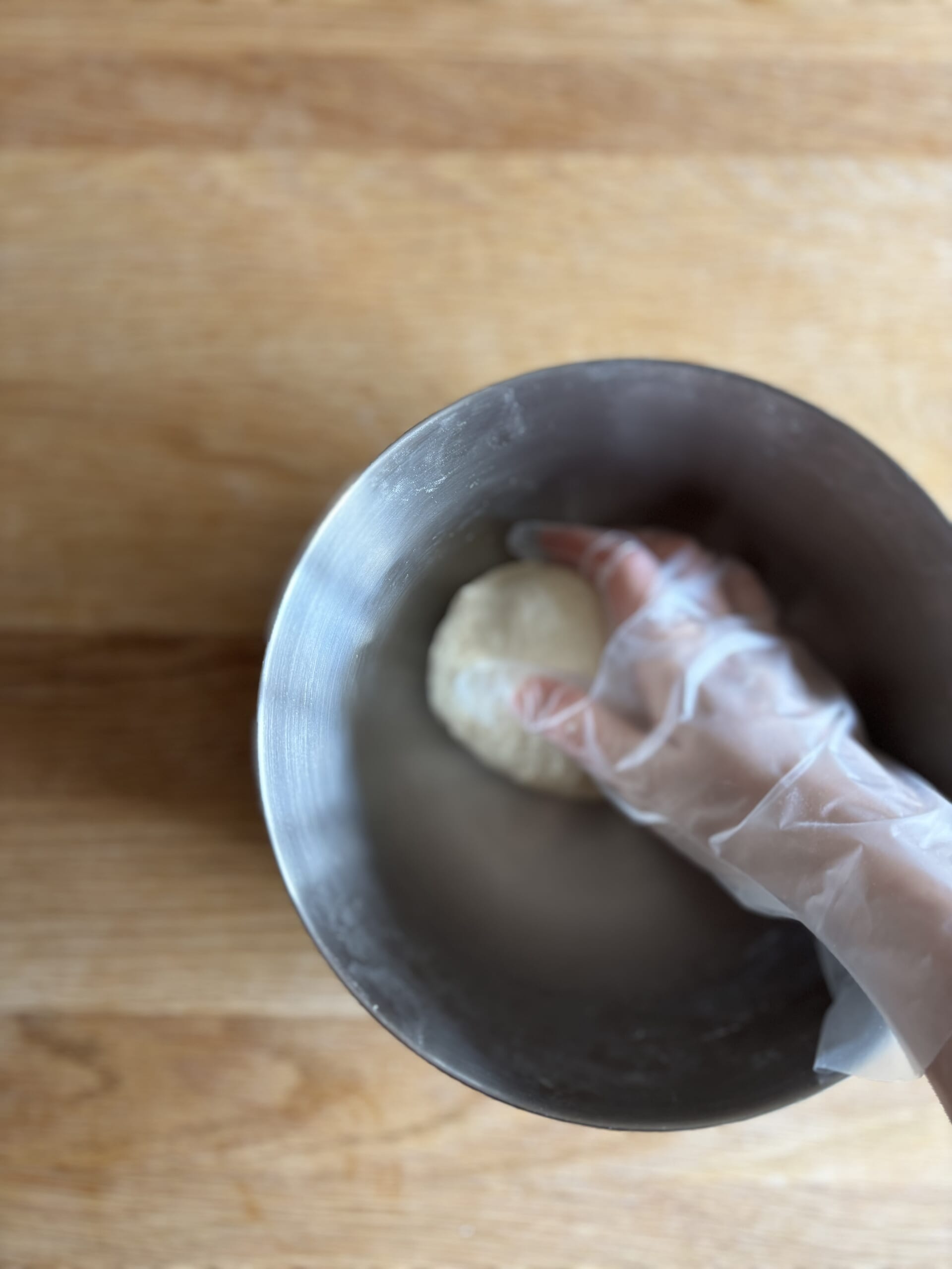 最初はヘラで混ぜて、ある程度まとまったら手で捏ねていきます。