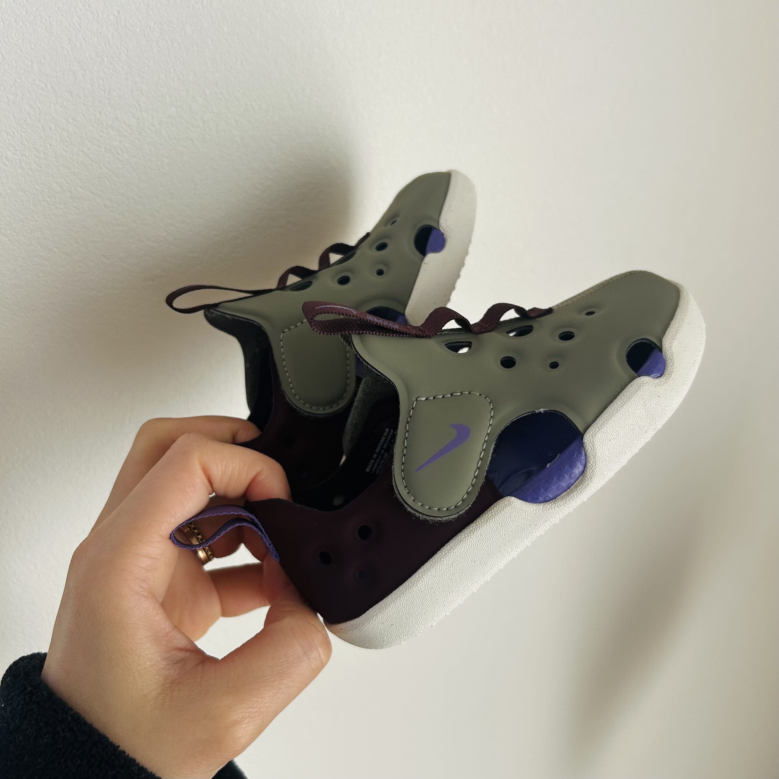 グレーとパープルのかっこ可愛いNIKEのデザインがお気に入りです。このサンダルは通常サイズよりも少し大きめに作られているので、子どもたちのこだわりが出てこなければ来年も履けそうです(笑)