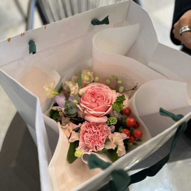 パンケーキが席に運ばれてきたタイミングで、ちひろさんにお花と寄せ書きをお渡ししました。