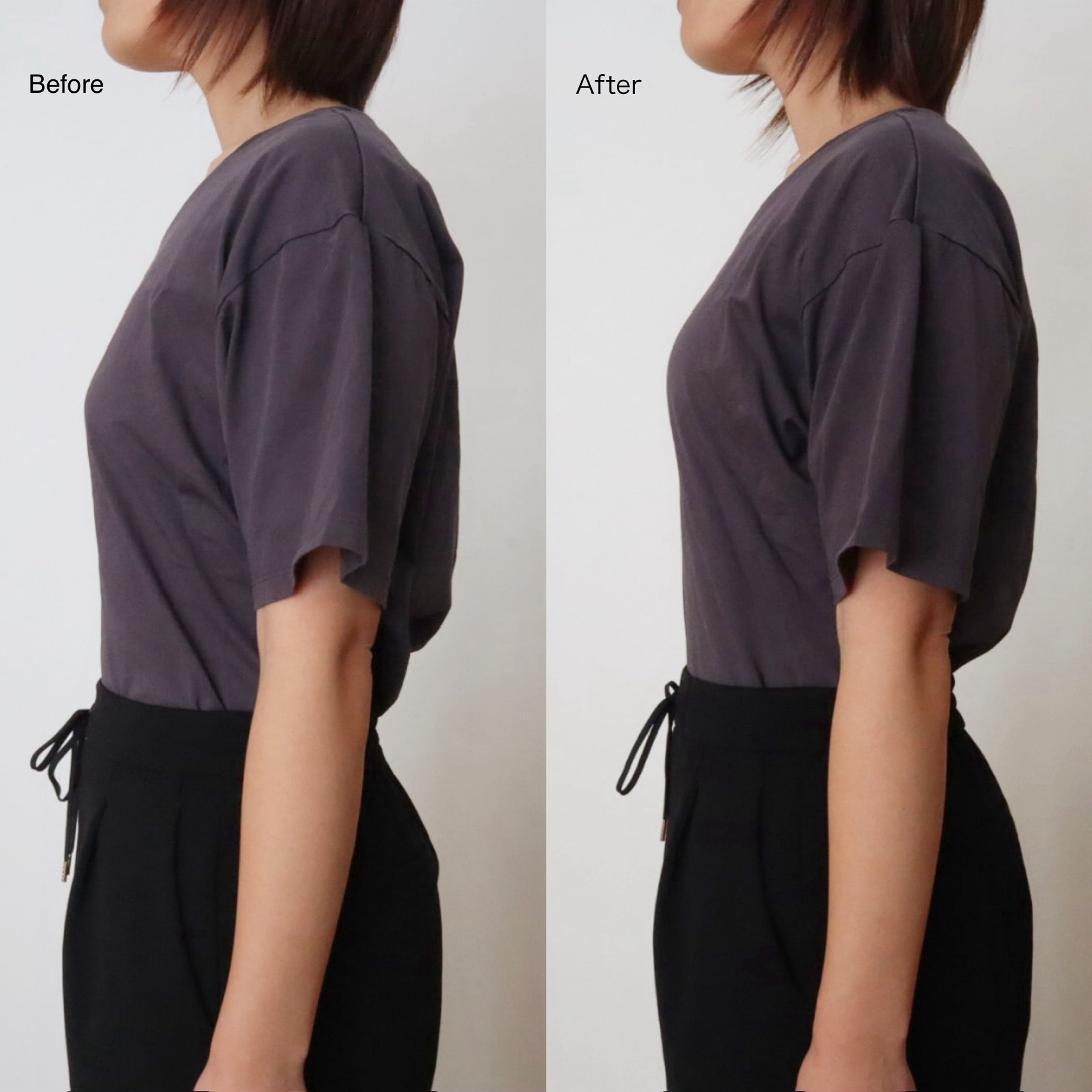 それが、Afterをみるとデコルテは自然にふっくらハリが出ているように見え、バスト位置も上がっています。