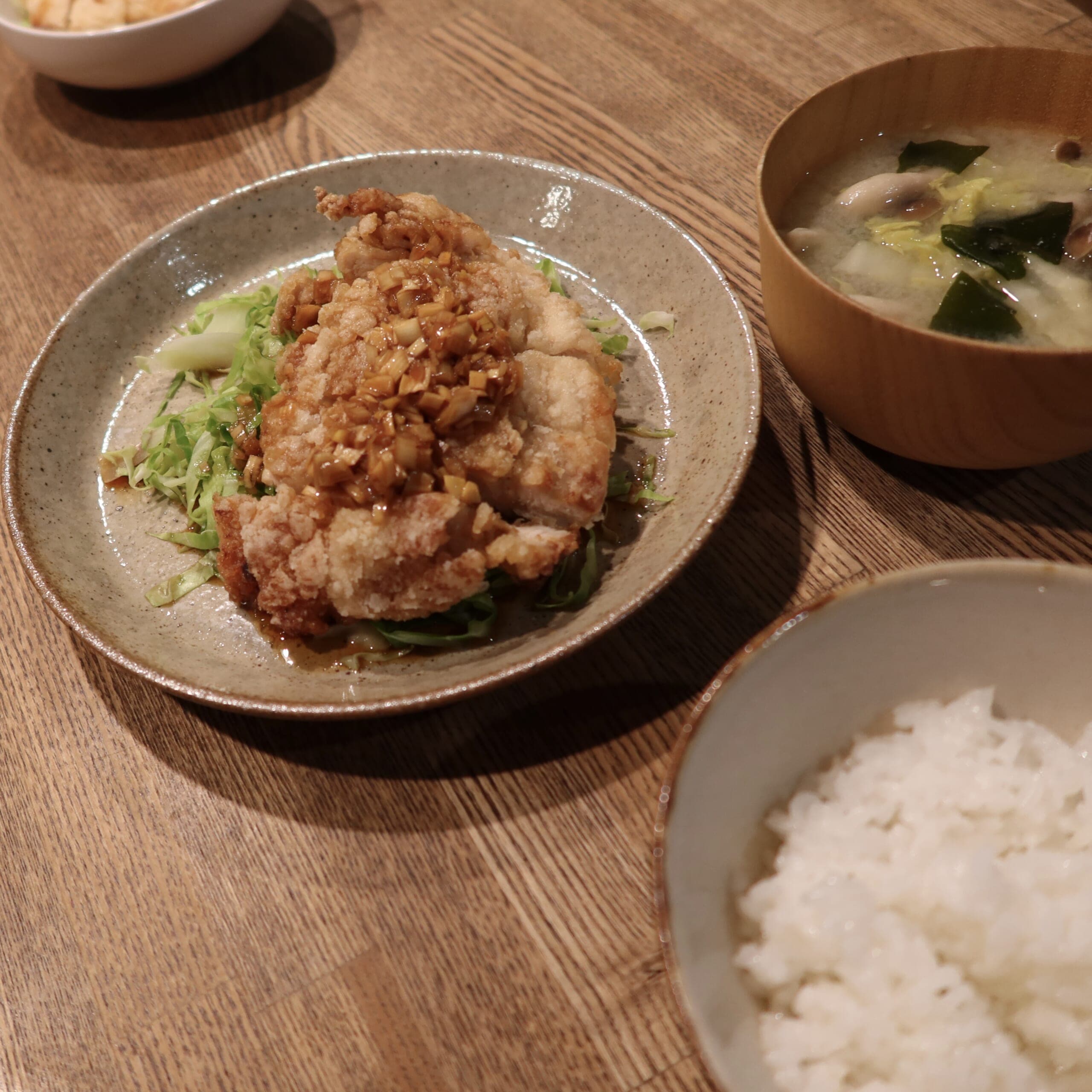 他にあれこれ作らなくても十分満足できるボリュームと、鶏肉の下に敷いた、サッと熱湯をかけたキャベツ(レシピではレタス)も油淋鶏のタレが絡んでモリモリ食べられました。