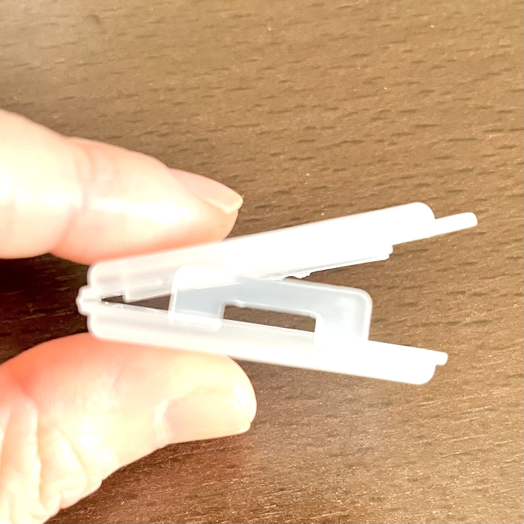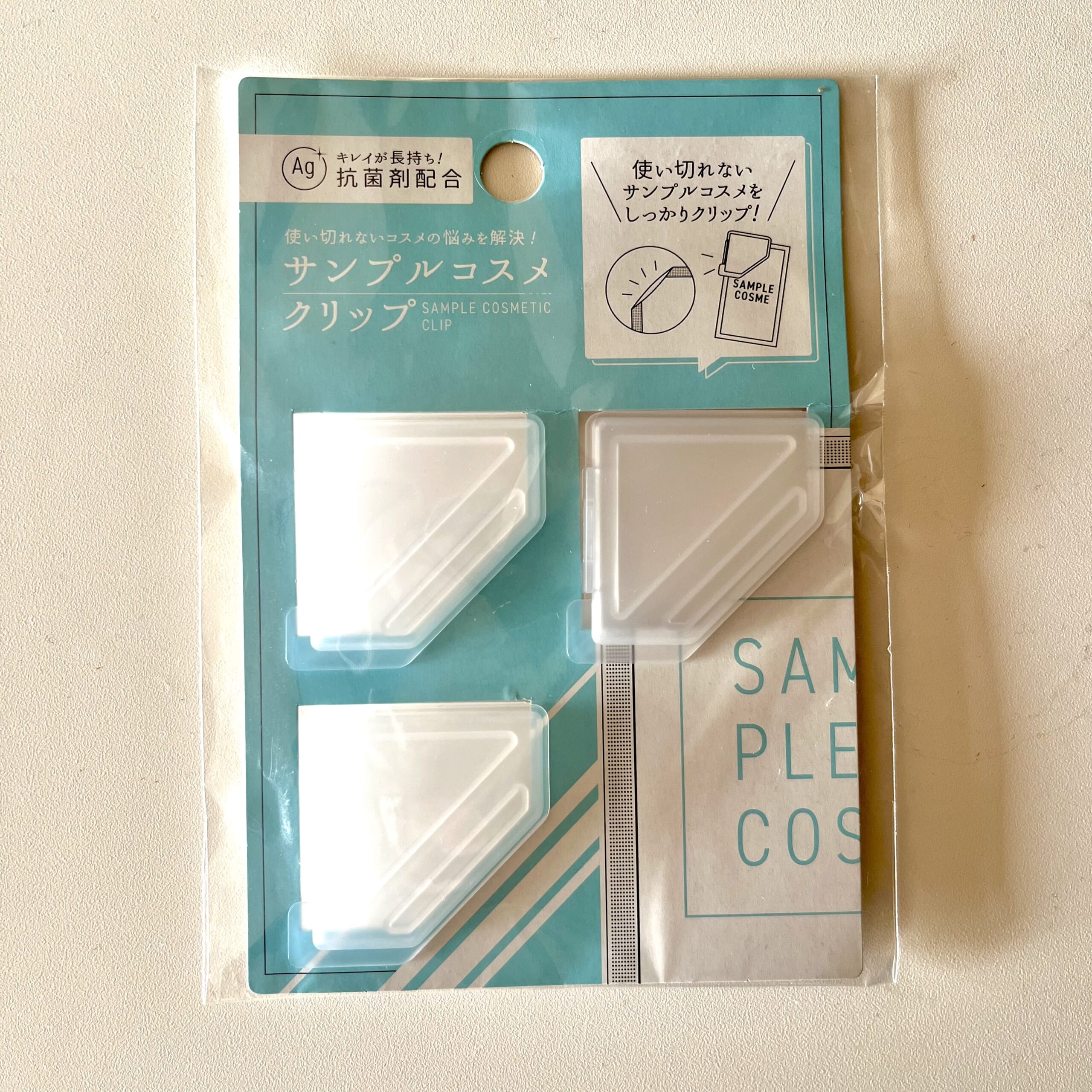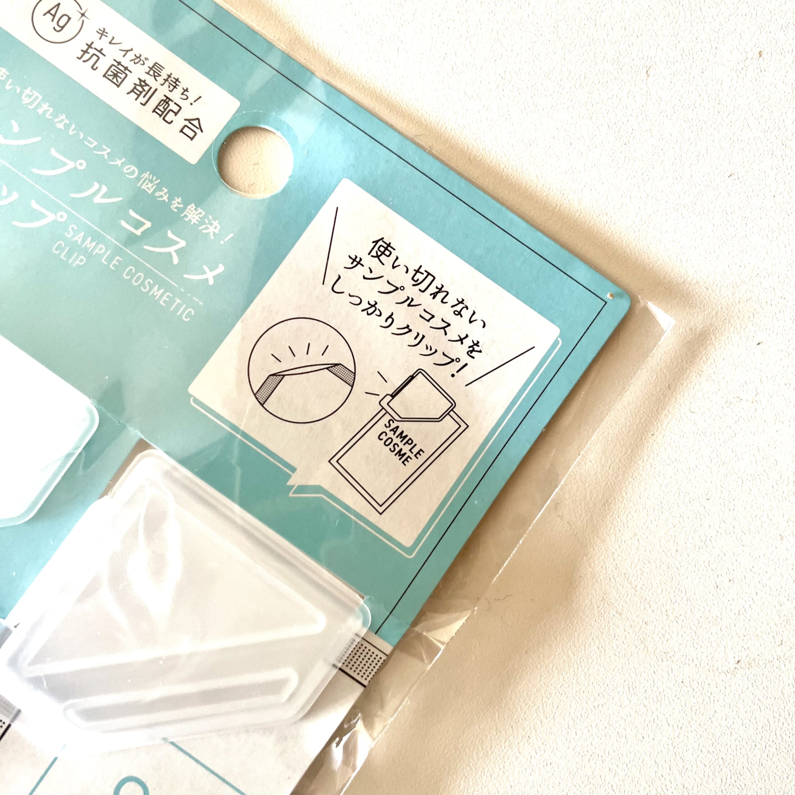 開けてしまったサンプルの口を挟んで止められるクリップ!これは思いつかなかった。110円で3個入りです。なのに抗菌加工もしてあるという。すごいなセリアさん。