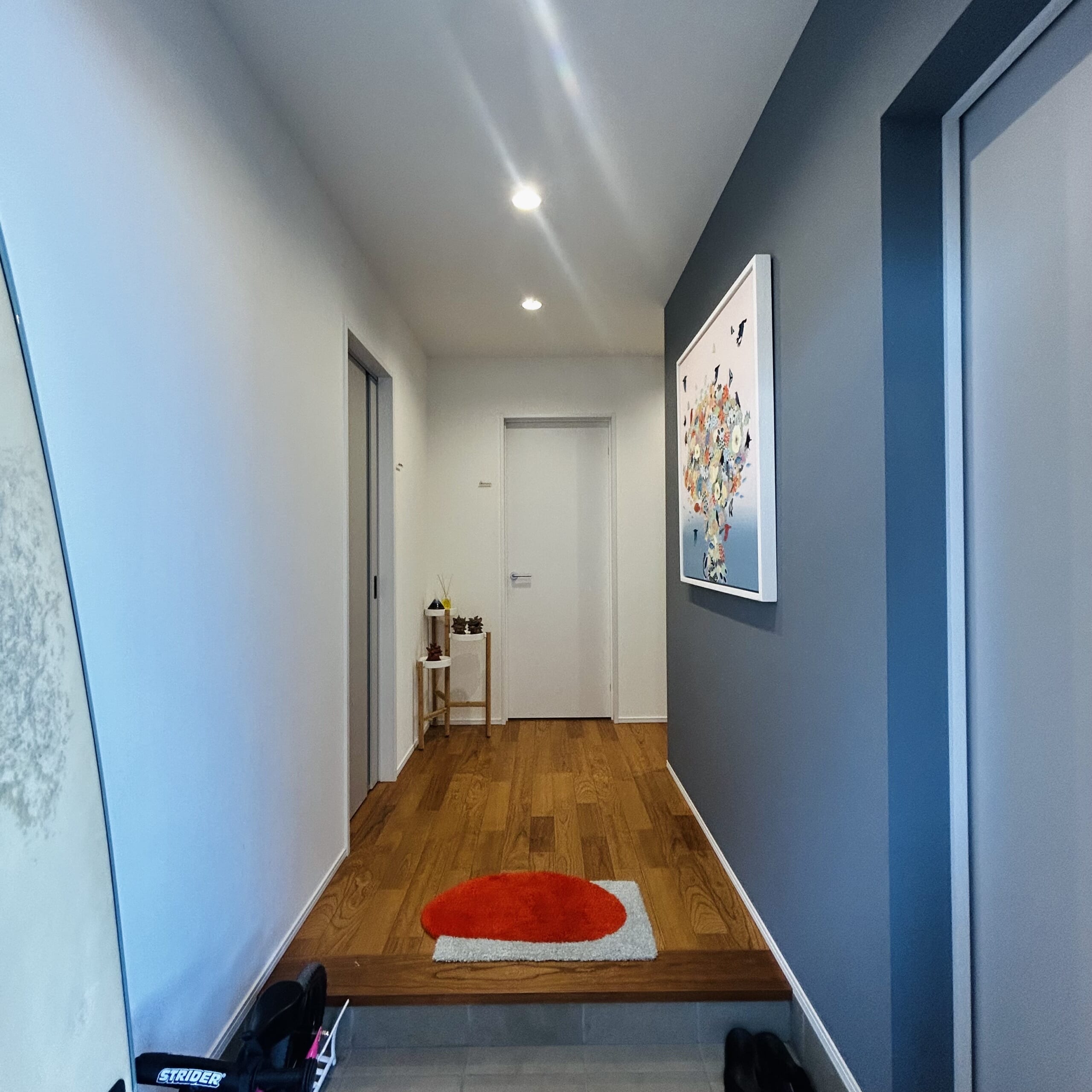 BeforeAfterの写真がないので比較するのが難しいですが、右側のクロスがブルーグレーなのでさらに暗い印象を与える玄関でした。絵と玄関マットの色味が入っただけでもパッと明るい雰囲気にすることができました。