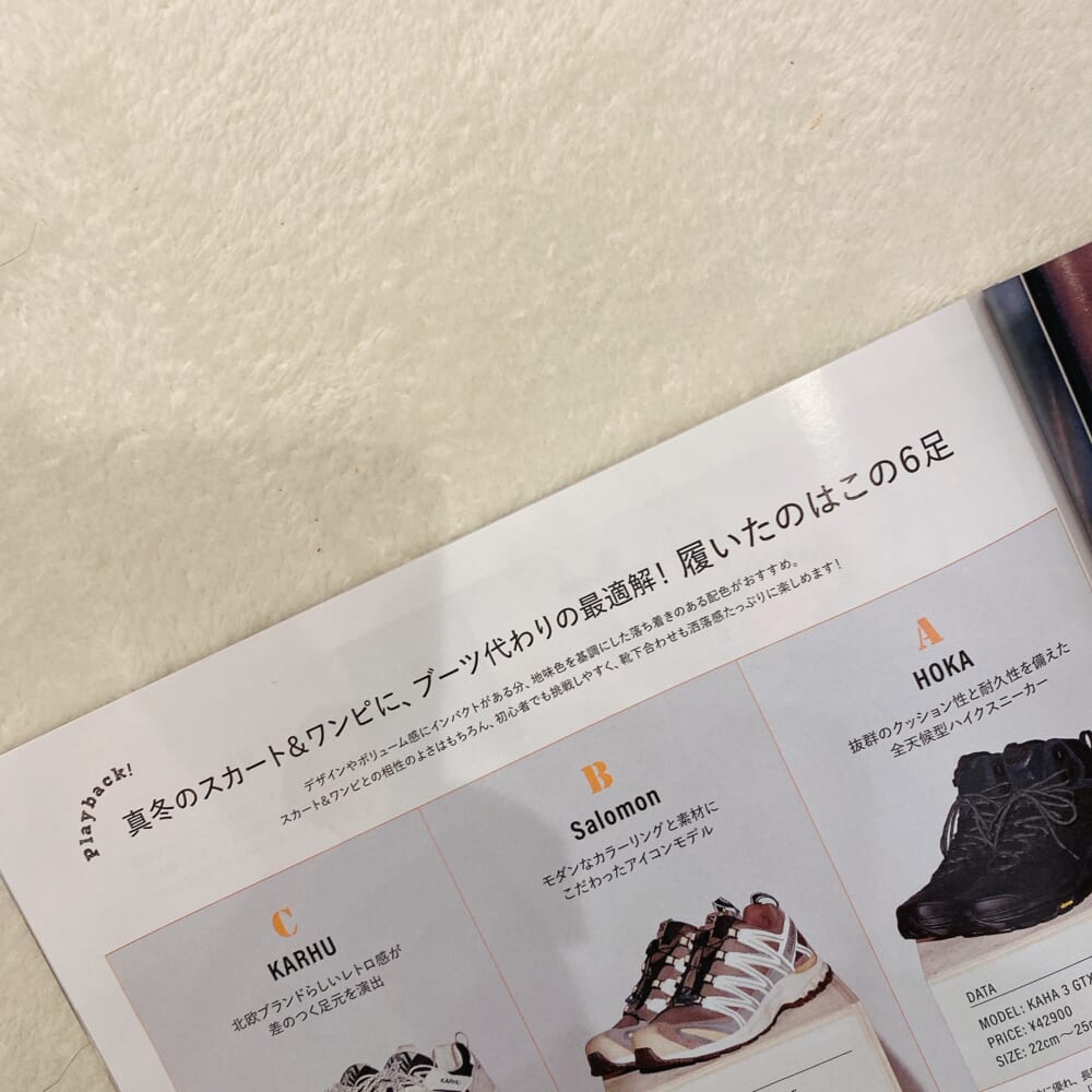 特にp59の見出し「真冬のスカート&ワンピに、ブーツ替わりの最適解!」。そうなんですよ~、ブーツを合わせたくなるスカートコーデに、ボリュームスニーカーをあわせるとなんだか新鮮で!