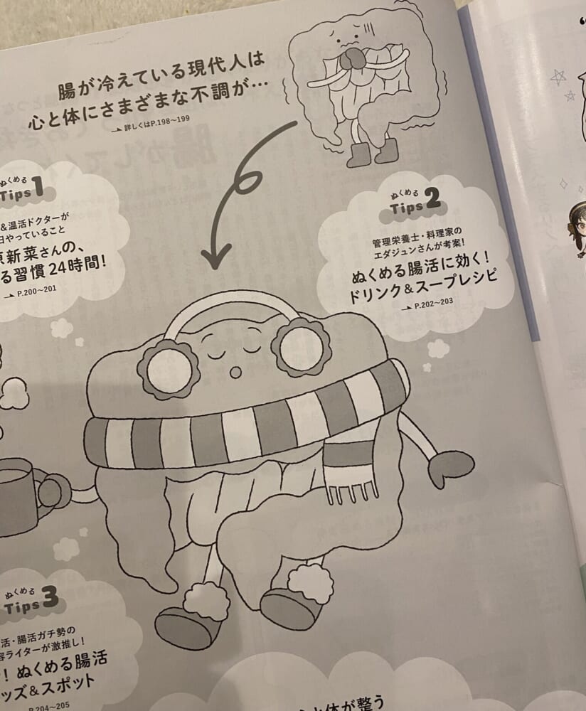 とっても寒がりの私。家では「まるでこたつソックス」をはいたり、腰にカイロを貼ったり、ニットはタートルネックが基本だったりと冷やさない工夫はしていました。でも今回の特集は温活ではなく「腸活」。ただホットドリンクを飲むというだけではなくて、しょうがの入ったもので芯からあたためるなど、腸を元気にすることで毎日健やかに過ごせるようになるヒントがたくさん。