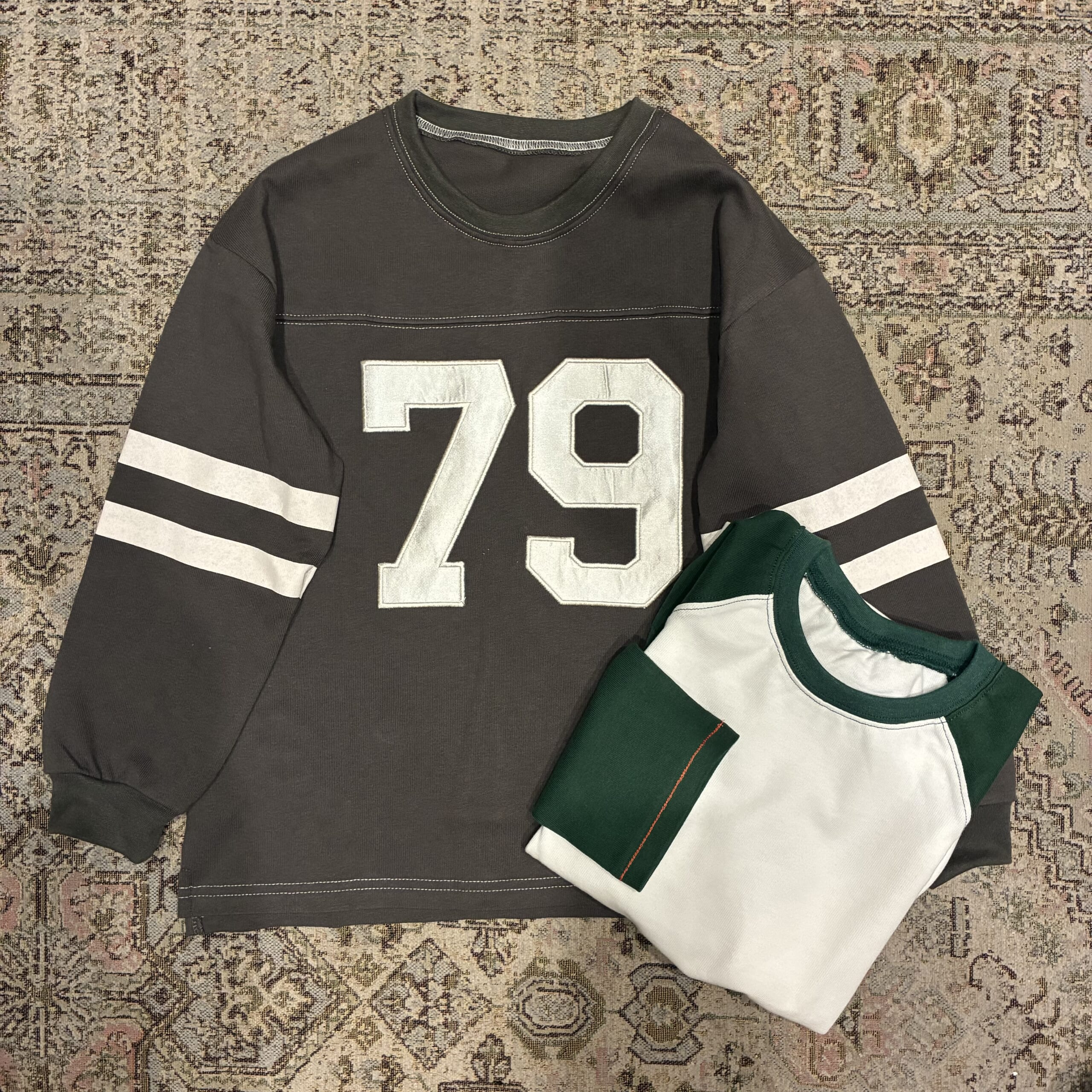 ZOZOTOWNや楽天などのオンラインショップで購入できる「エバークローゼット」のロンTも春先から活躍しそうだったので、兄妹それぞれに購入。ナンバー部分がサテン生地で高見えするロンTはモノトーン期の娘用に。深いグリーンのラグランTは袖と裾のステッチがオレンジ色で可愛い。