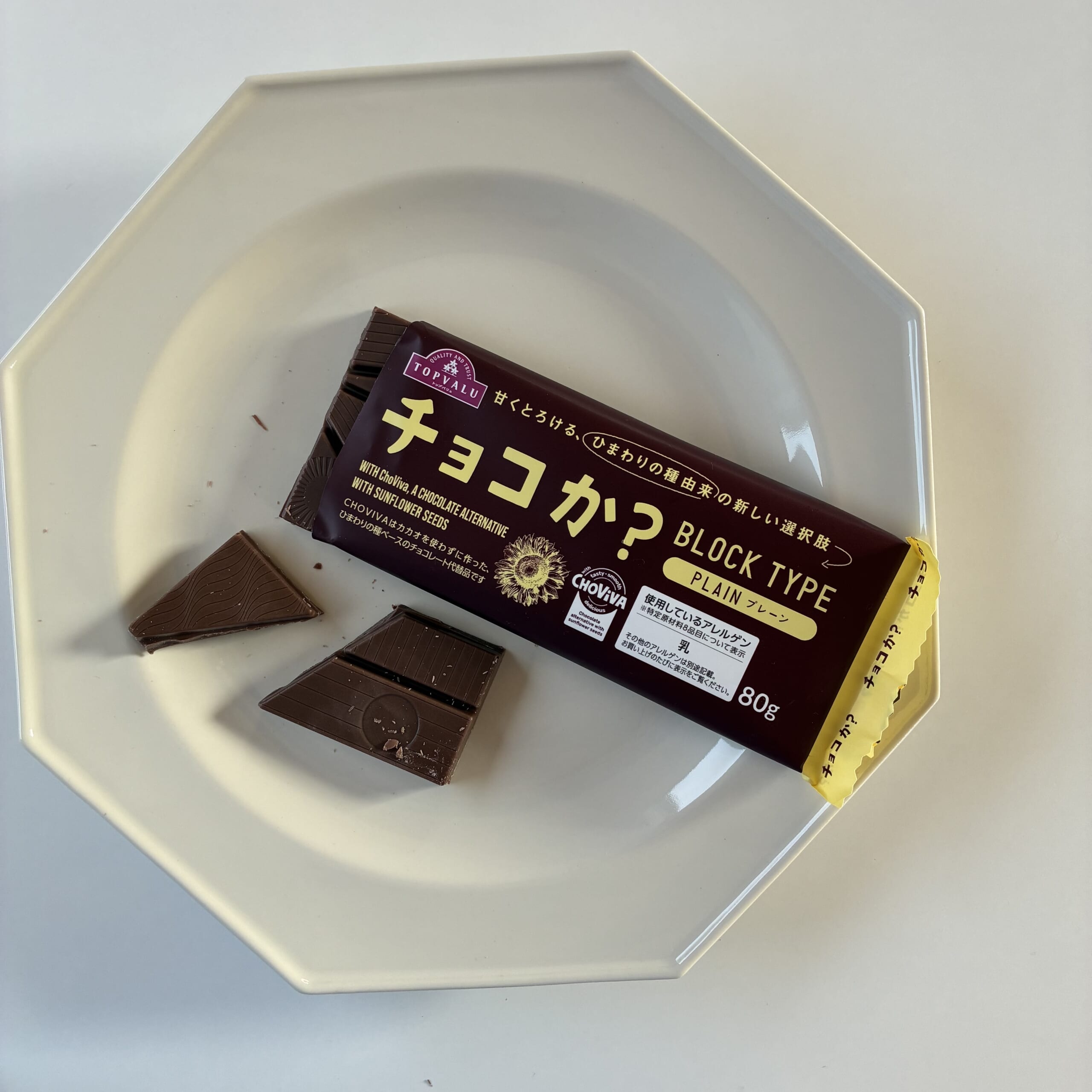 ブロックタイプのチョコか?もこのブログを書いている途中段階で購入し、さっそく食べてみることに。ミルクチョコのような甘いチョコレートの味でした◎食べてみて本当にびっくり!子ども達も「これチョコだね」と言って食べてました。